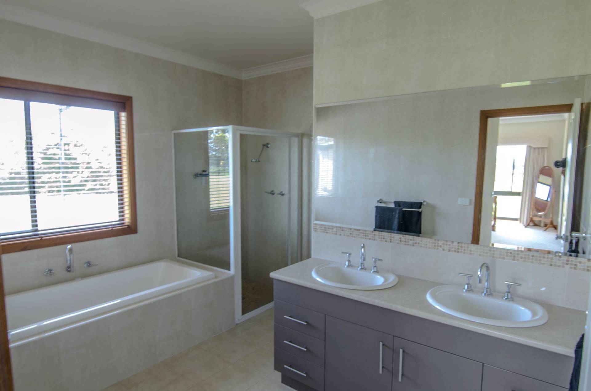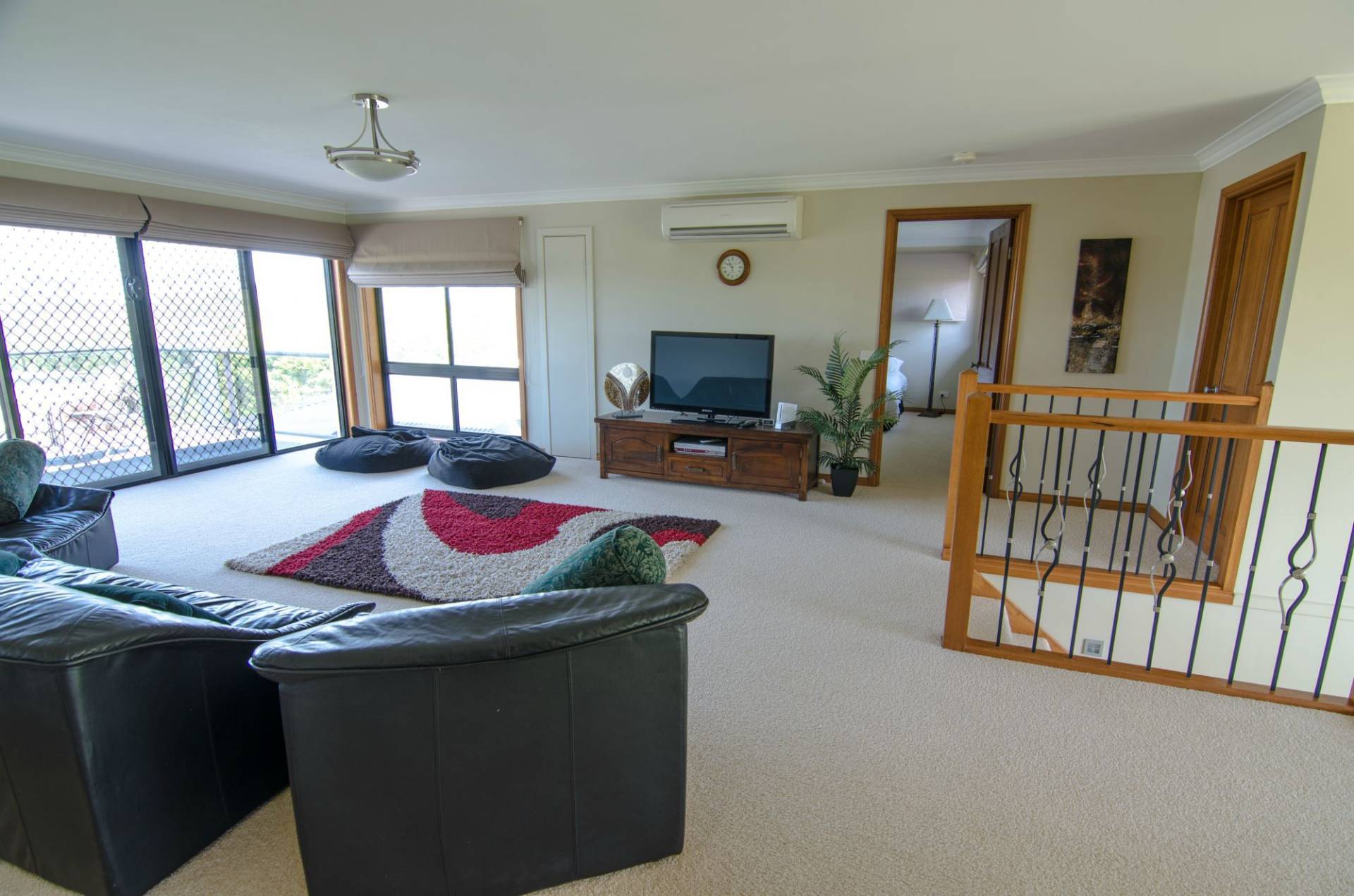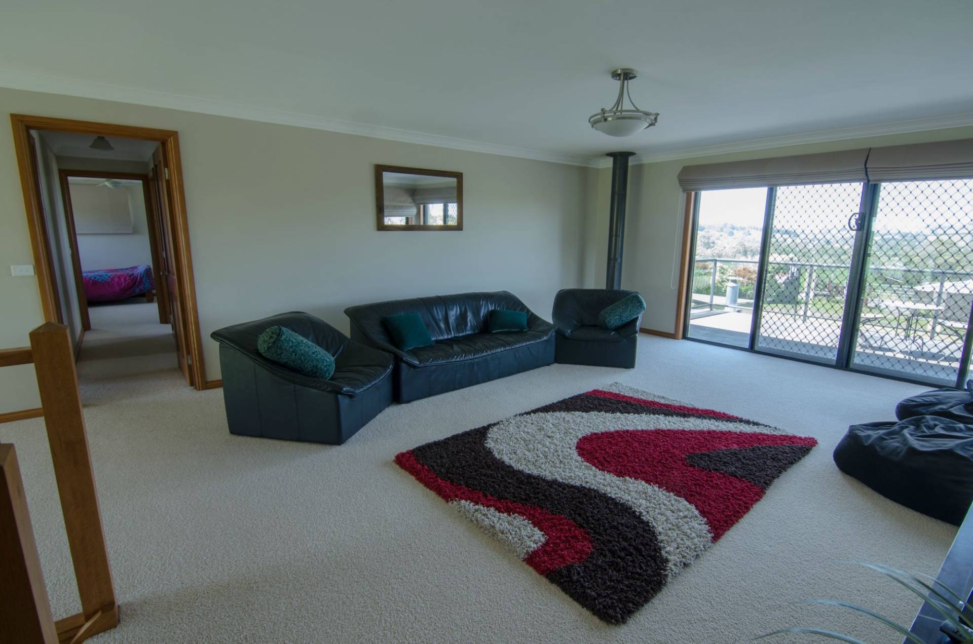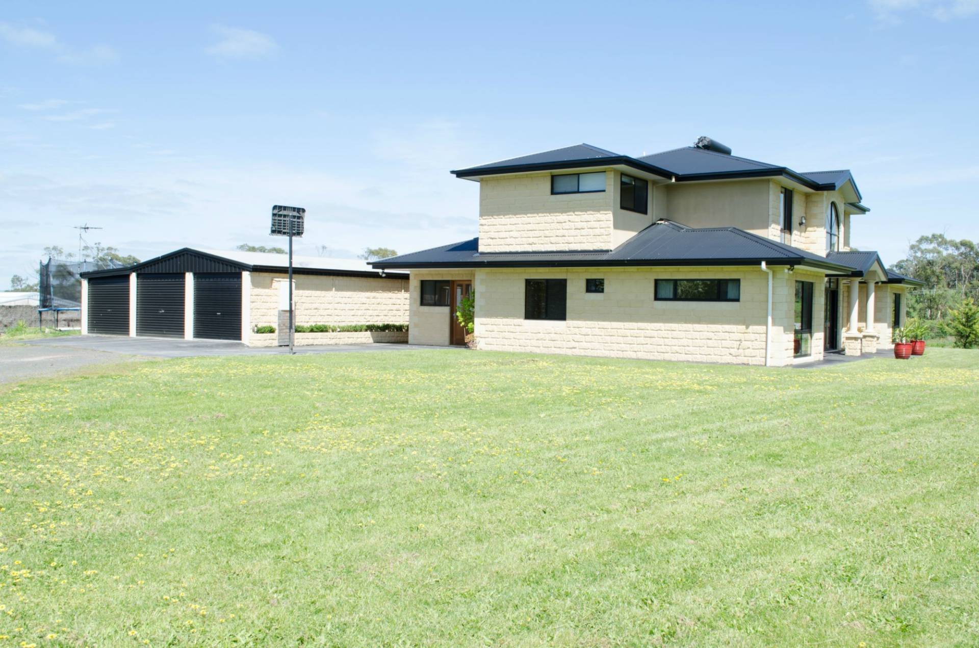Upstairs boasts a large living room with door access to upper level deck with great views looking back over 30 acres, as well as bedrooms 2, 3 and 4 all large in size and with robes. Other equally important additions to this home is the 5 car brick garage and attached under roof line entertainment room with a pizza oven built in, adjoining this entertainment room is the fully enclosed in ground heated swimming pool.