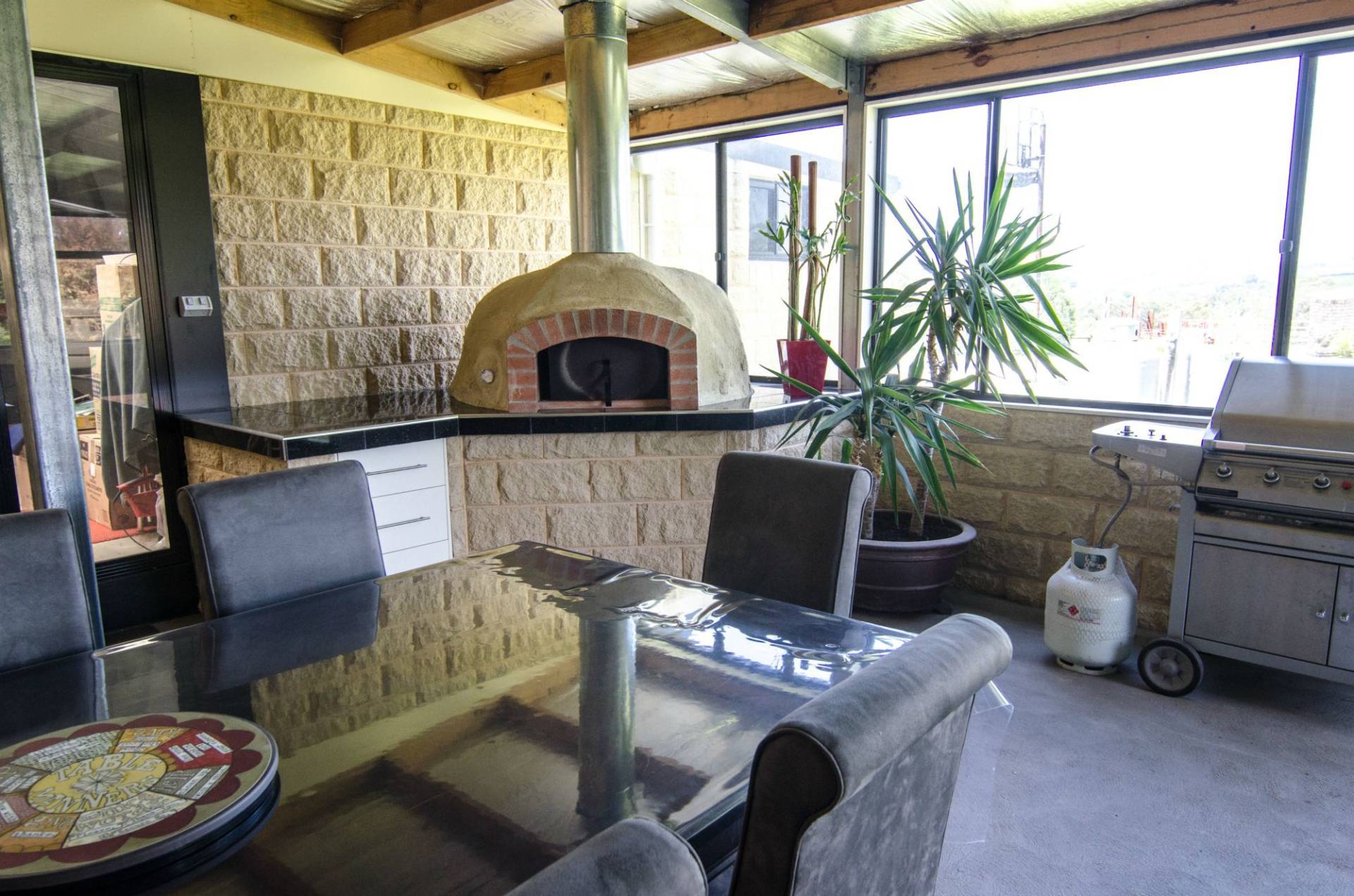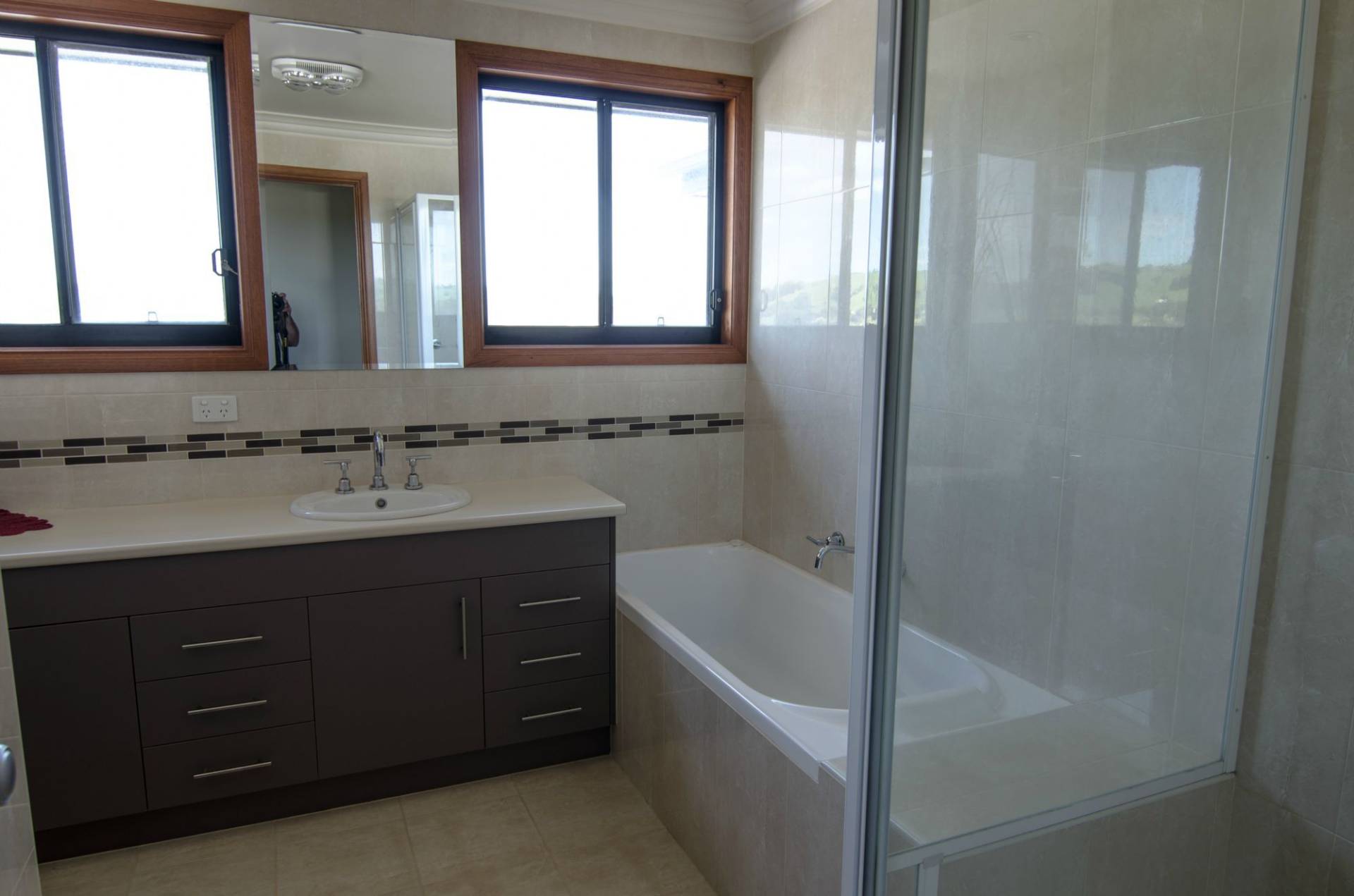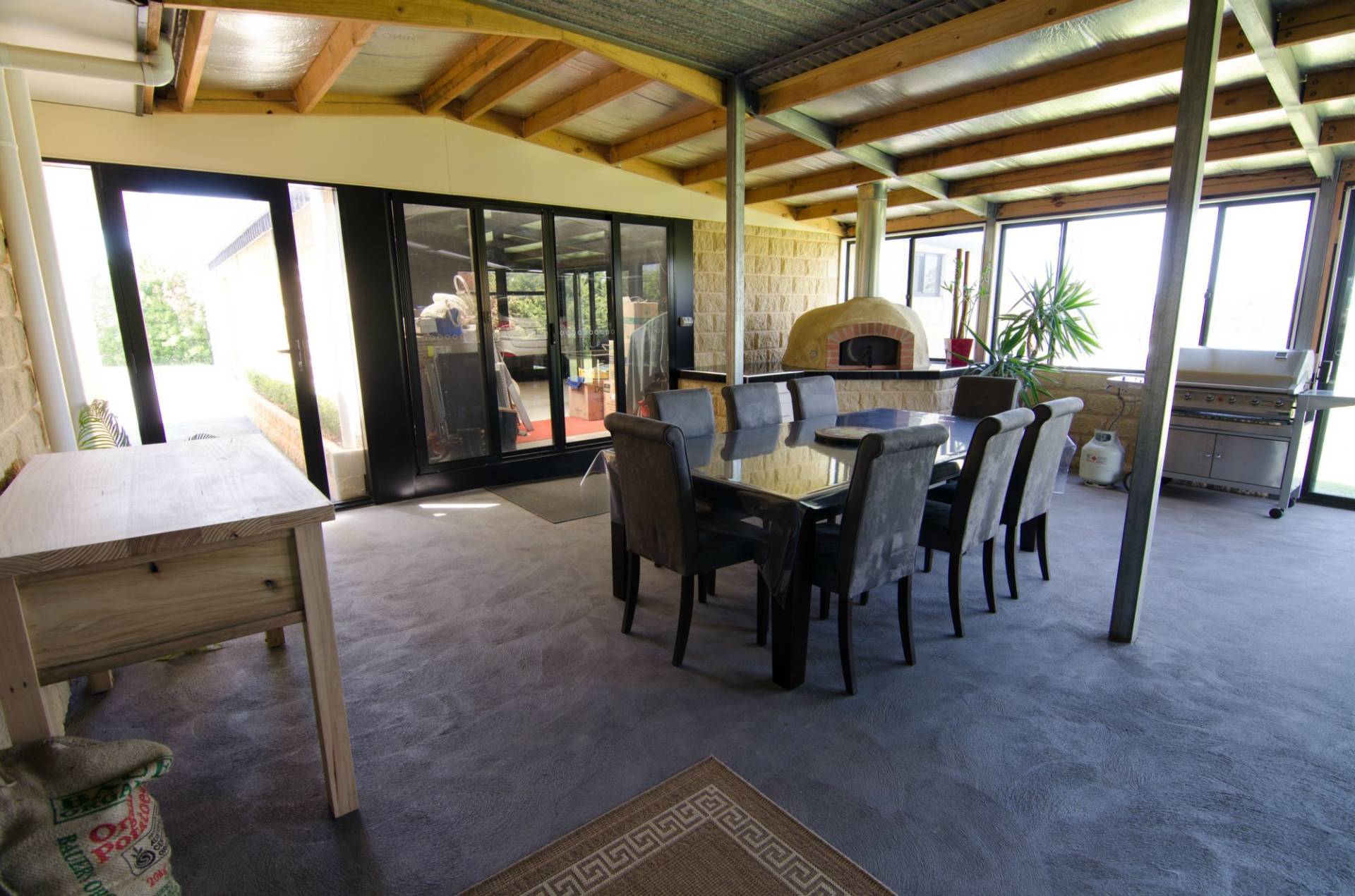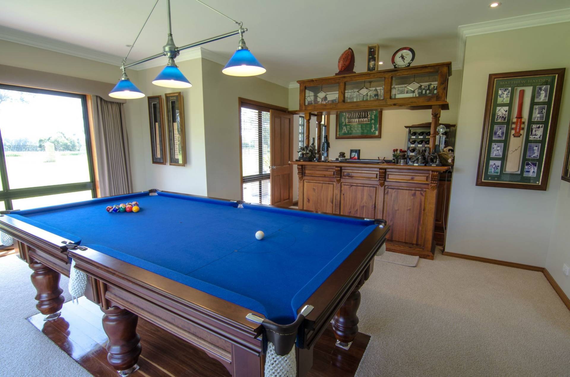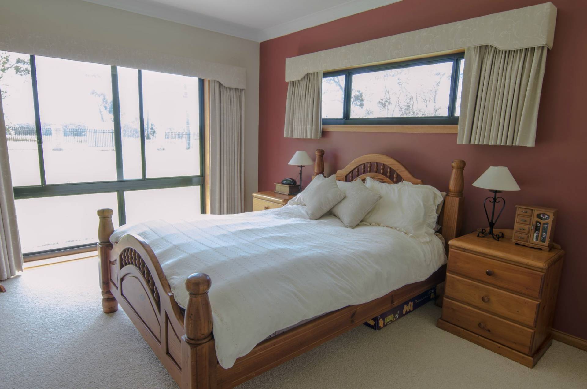 Upstairs boasts a large living room with door access to upper level deck with great views looking back over 30 acres, as well as bedrooms 2, 3 and 4 all large in size and with robes. Other equally important additions to this home is the 5 car brick garage and attached under roof line entertainment room with a pizza oven built in, adjoining this entertainment room is the fully enclosed in ground heated swimming pool.