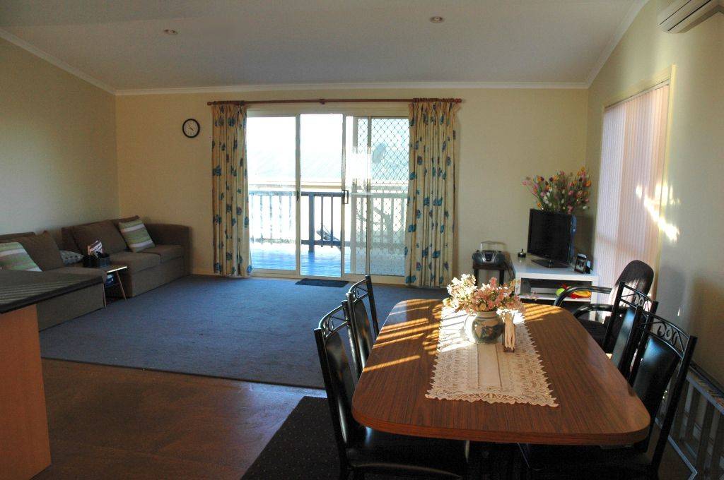 Upstairs, 3 bedrooms, large open plan kitchen, dining and living. Separate laundry and separate bathroom . Eastern Balcony and external stairs.