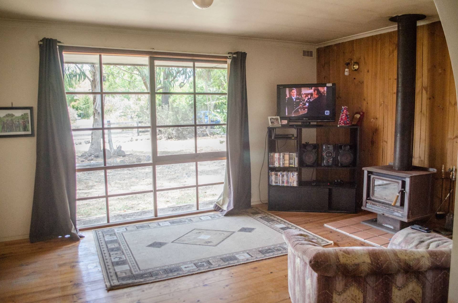 Separate lounge with timber floors and timber feature wall. Includes Wood heater.