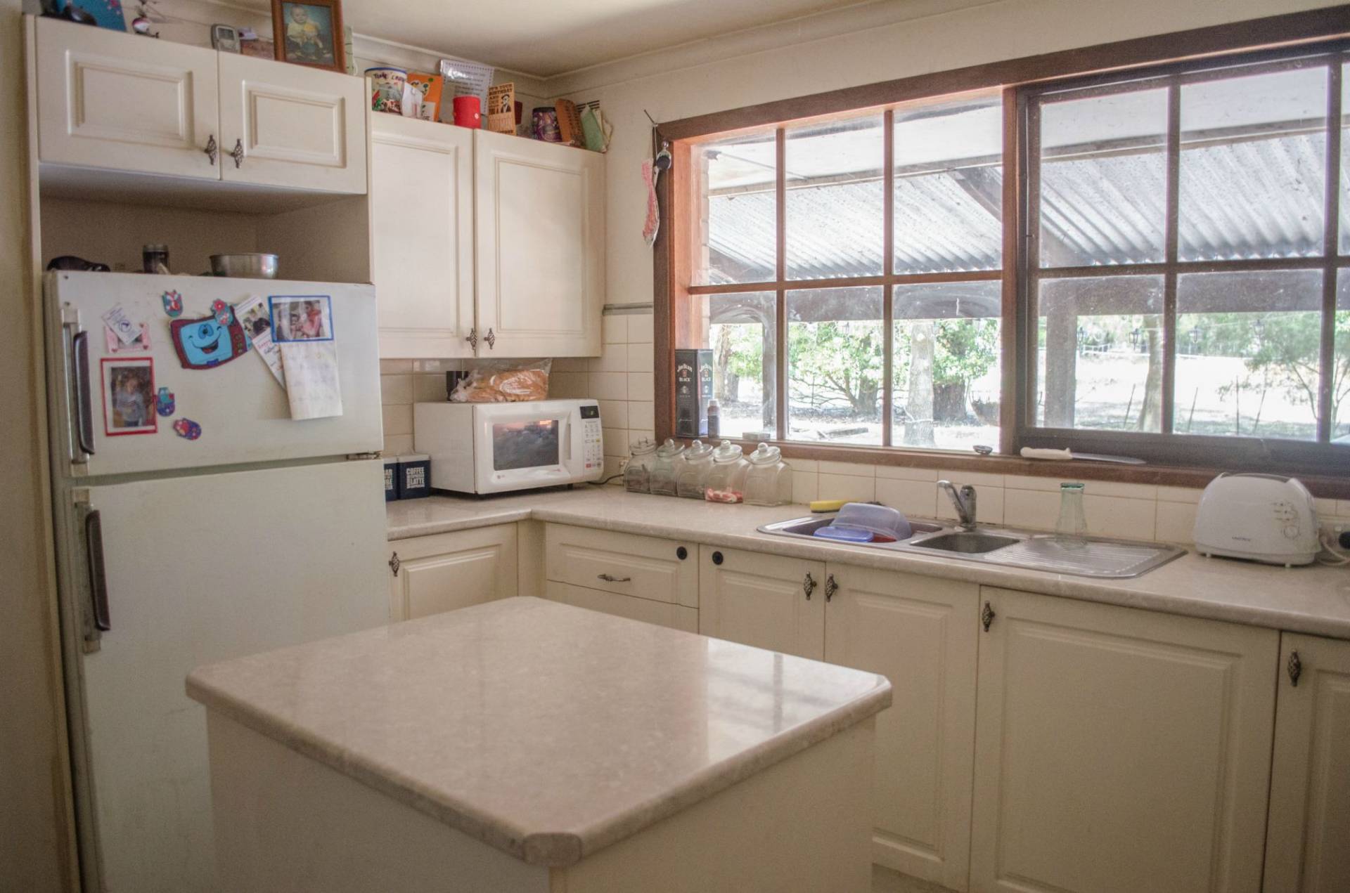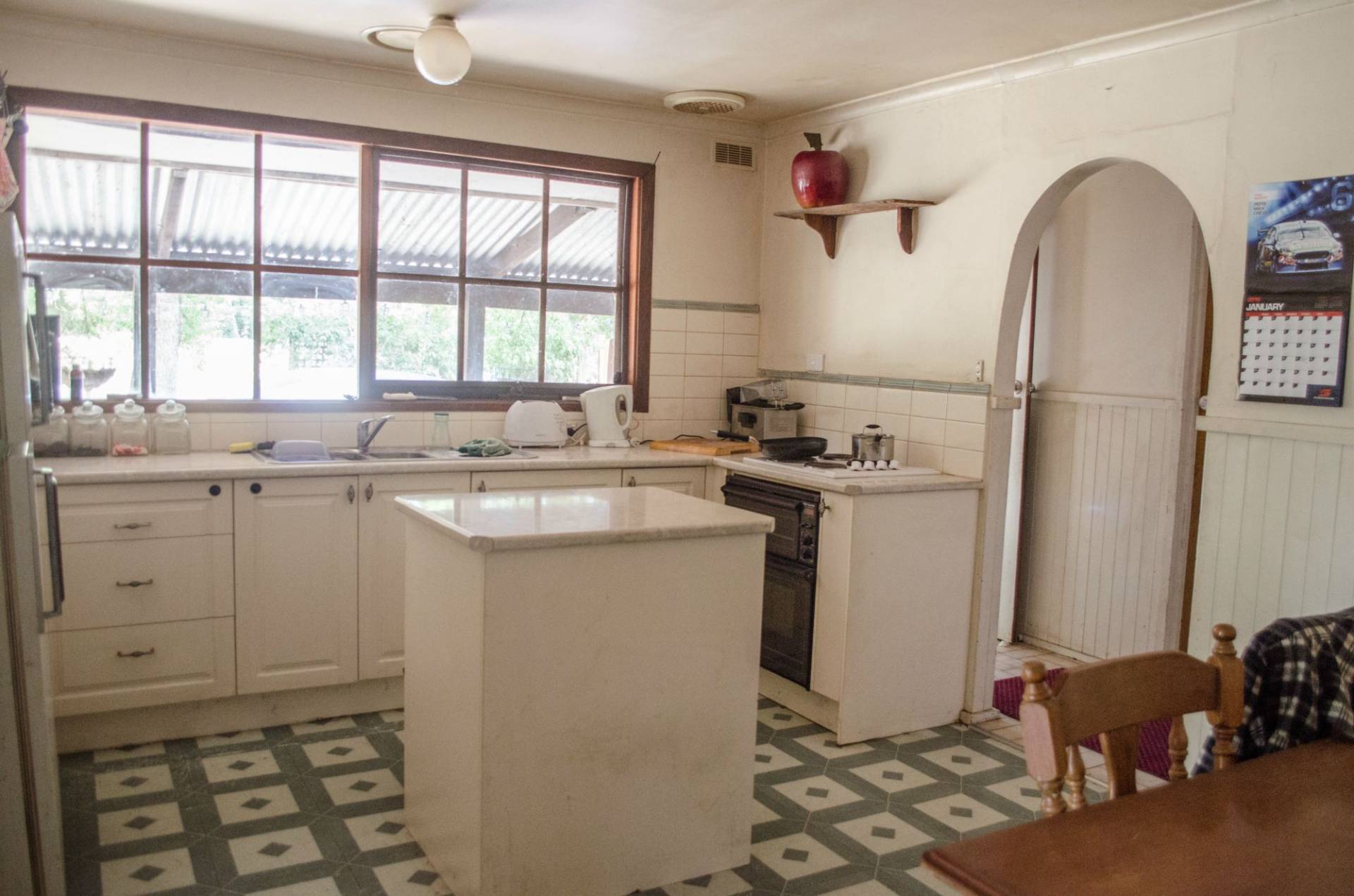 Modern kitchen which was renovated several years ago, with an Island bench including draws. Electric oven and hot plates and large pot draws.