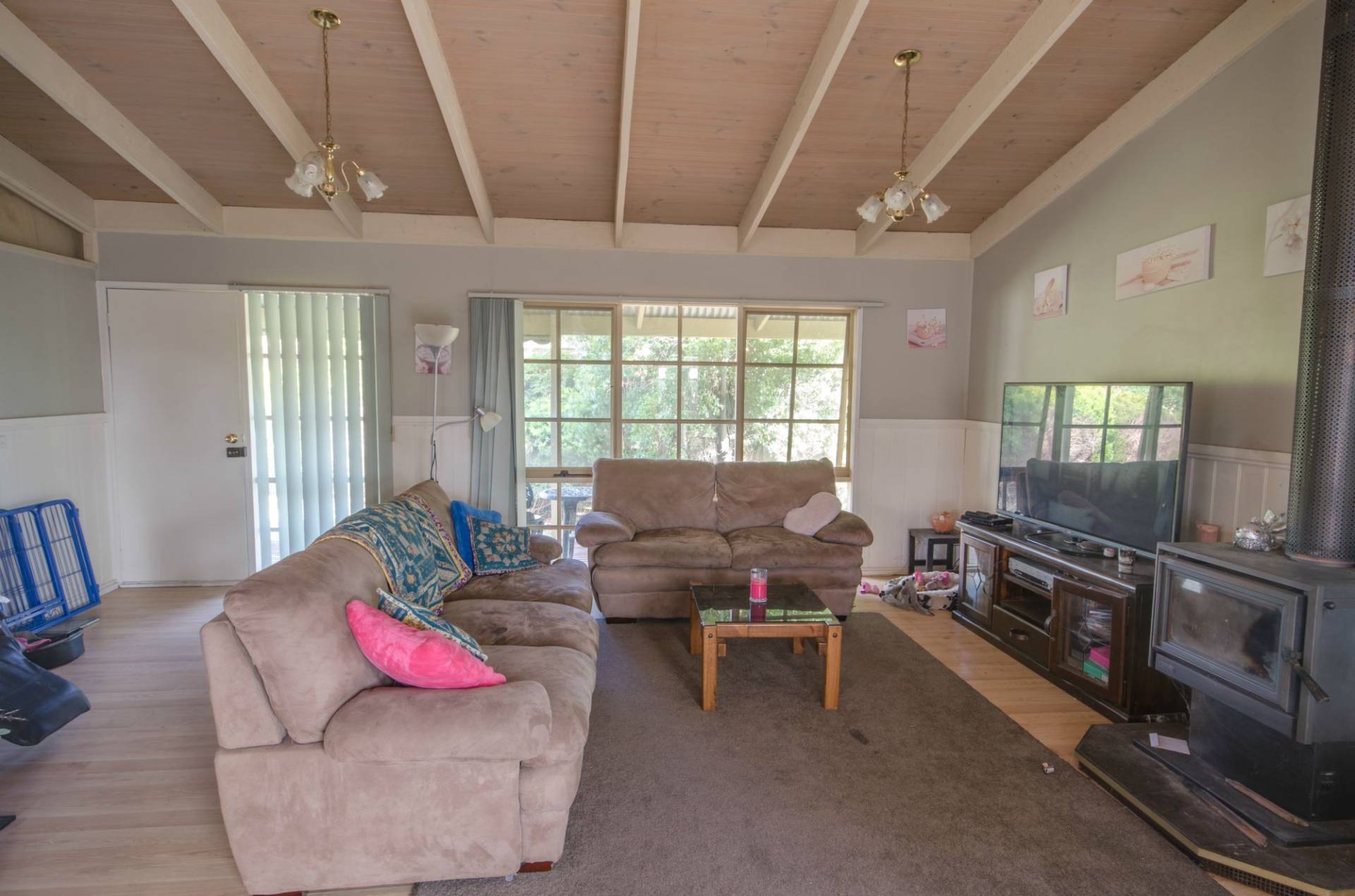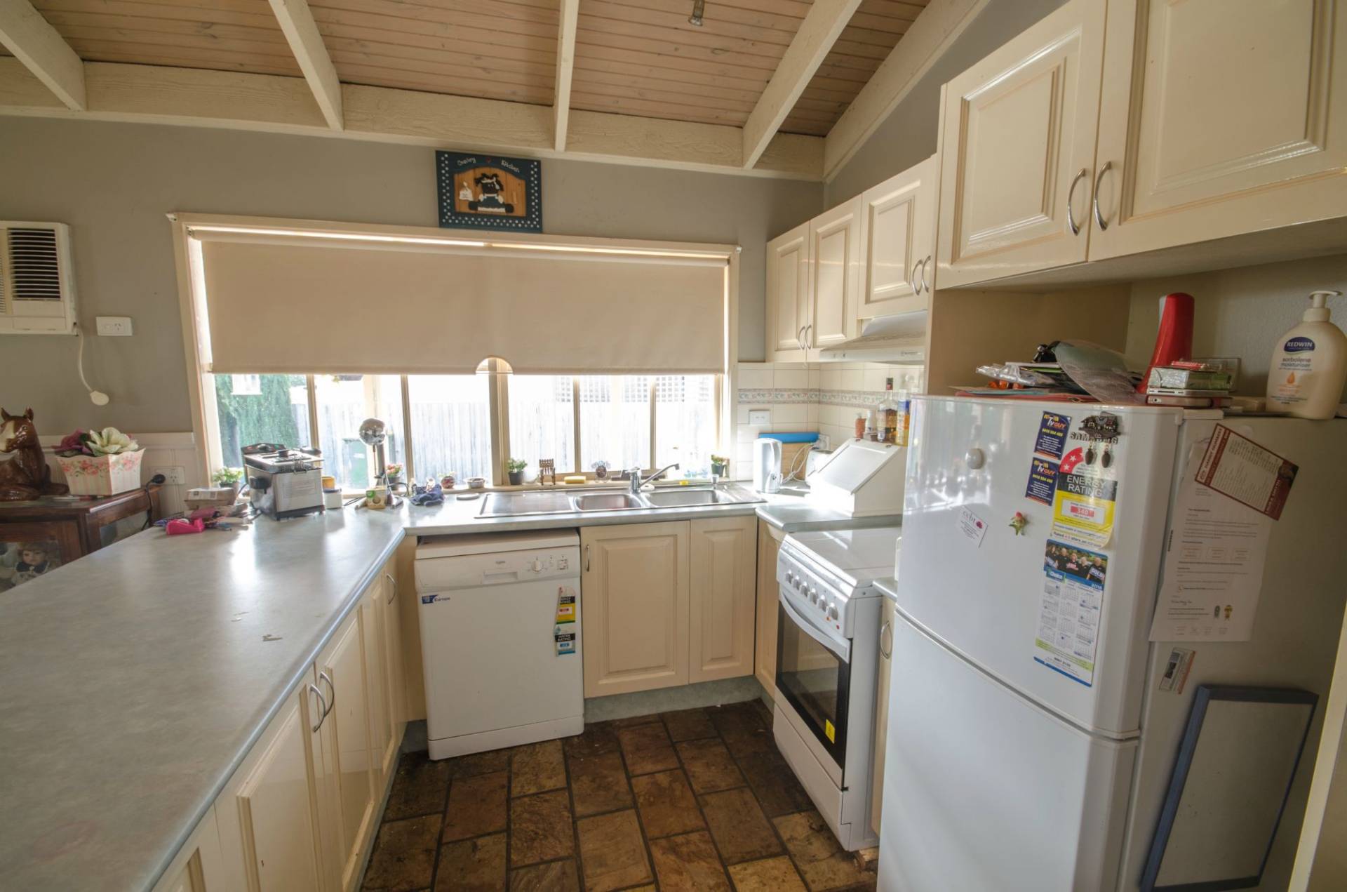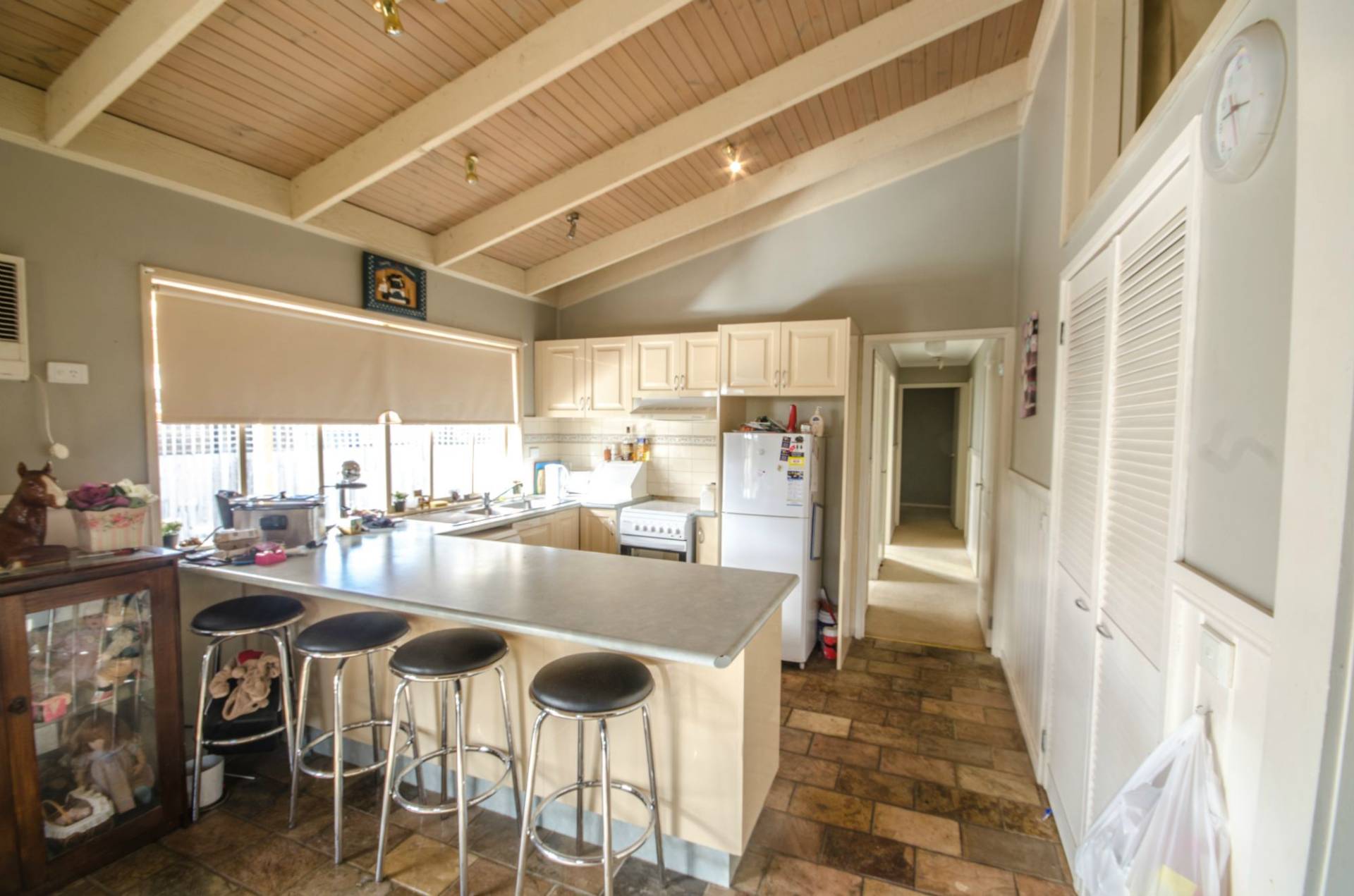 Open plan living, Daddo walls, wood heater and split system. Family room has slate flooring and raised ceilings. Beautiful kitchen with overhead cupboards and a two door pantry. Dishwasher has not long been replaced. Large bench space and electric stove. Master bedroom has WIR, Ensuite with bath. Second bathroom also has a bath, shower and vanity. Second & Third bedrooms both have wardrobes.
