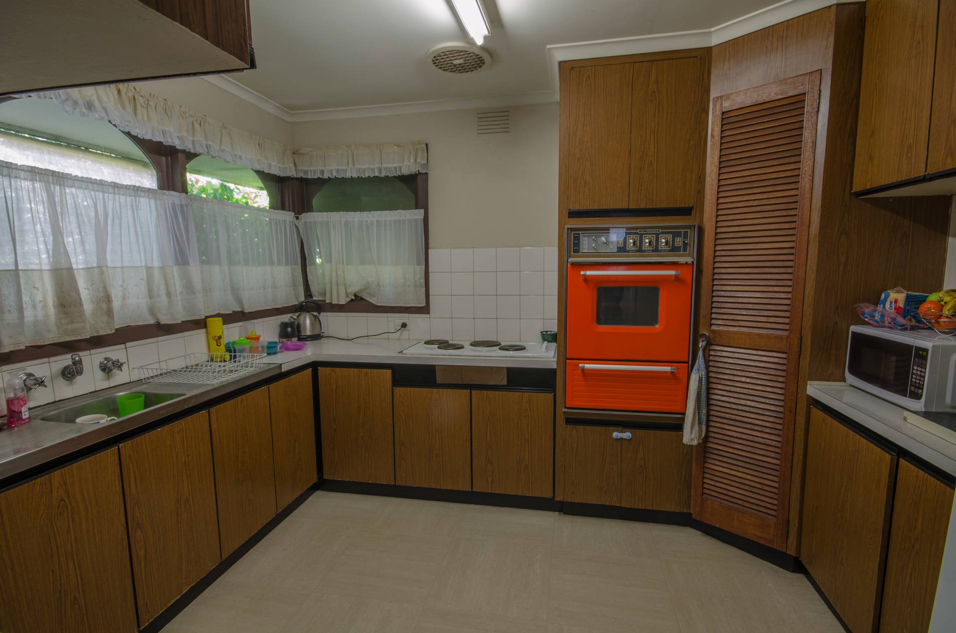 Spacious kitchen, wall oven, electric hotplates, pantry, family room, double doors to undercover patio and gas ducted heating. Garage has power and concreted floor.