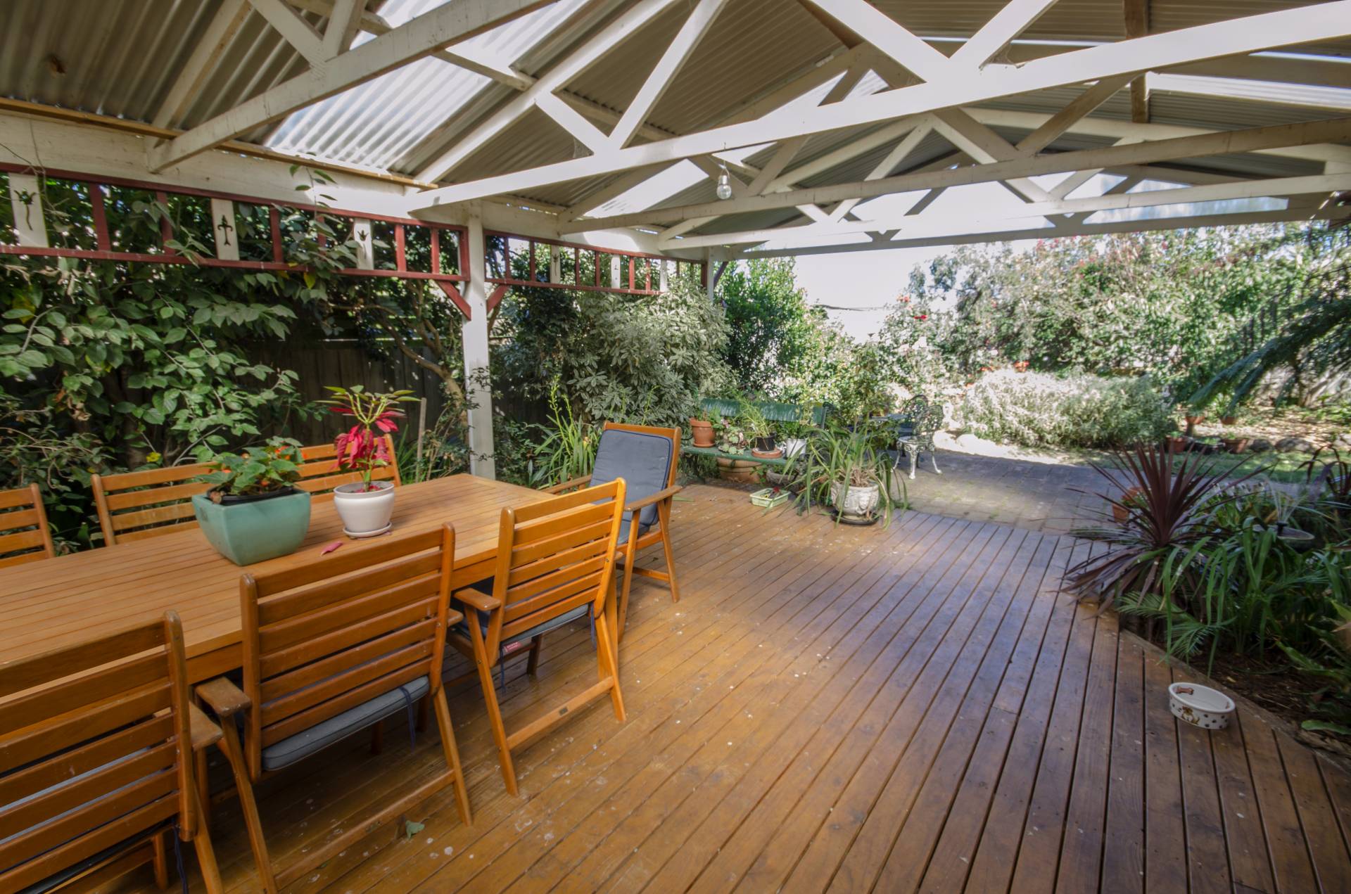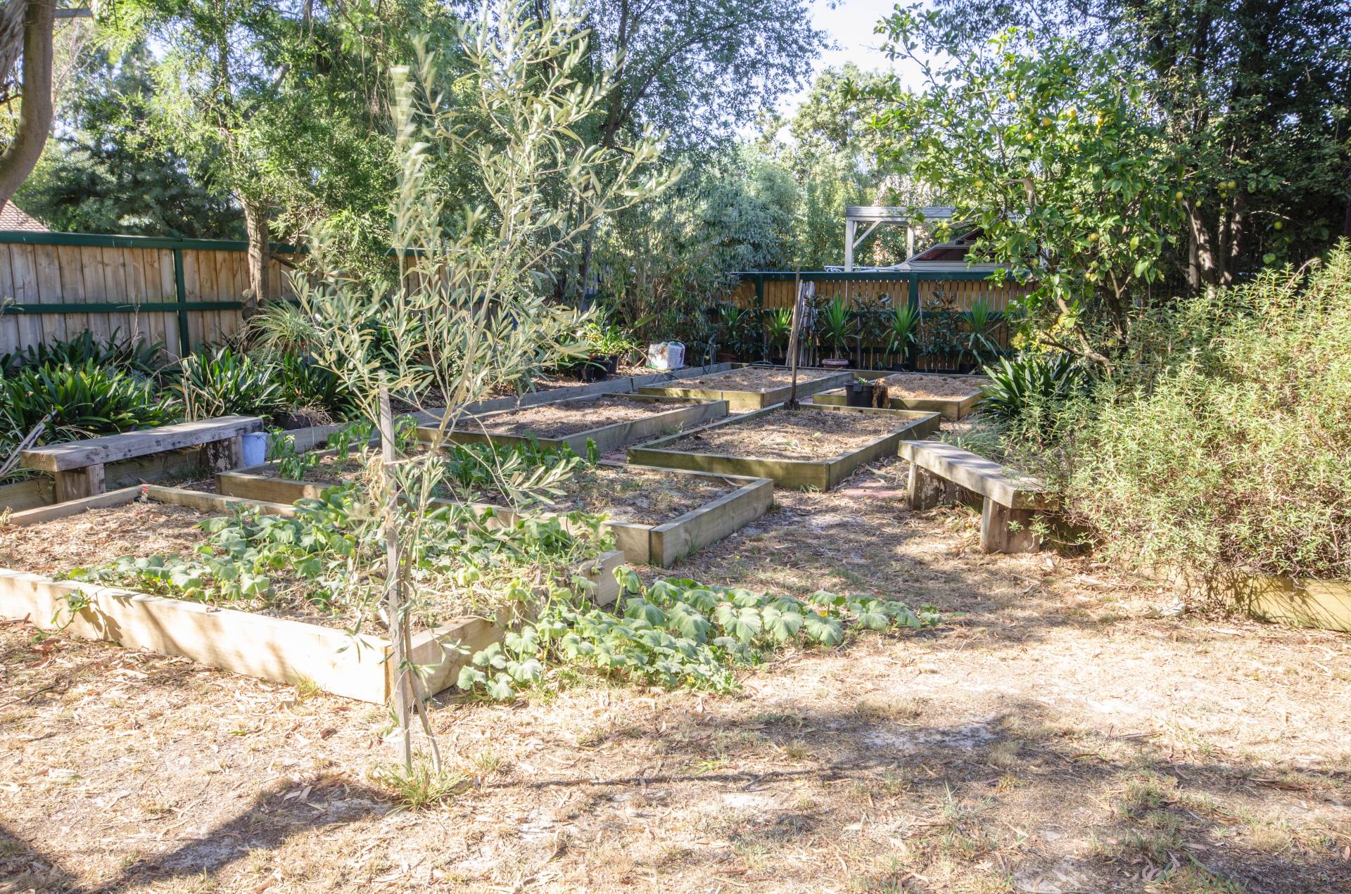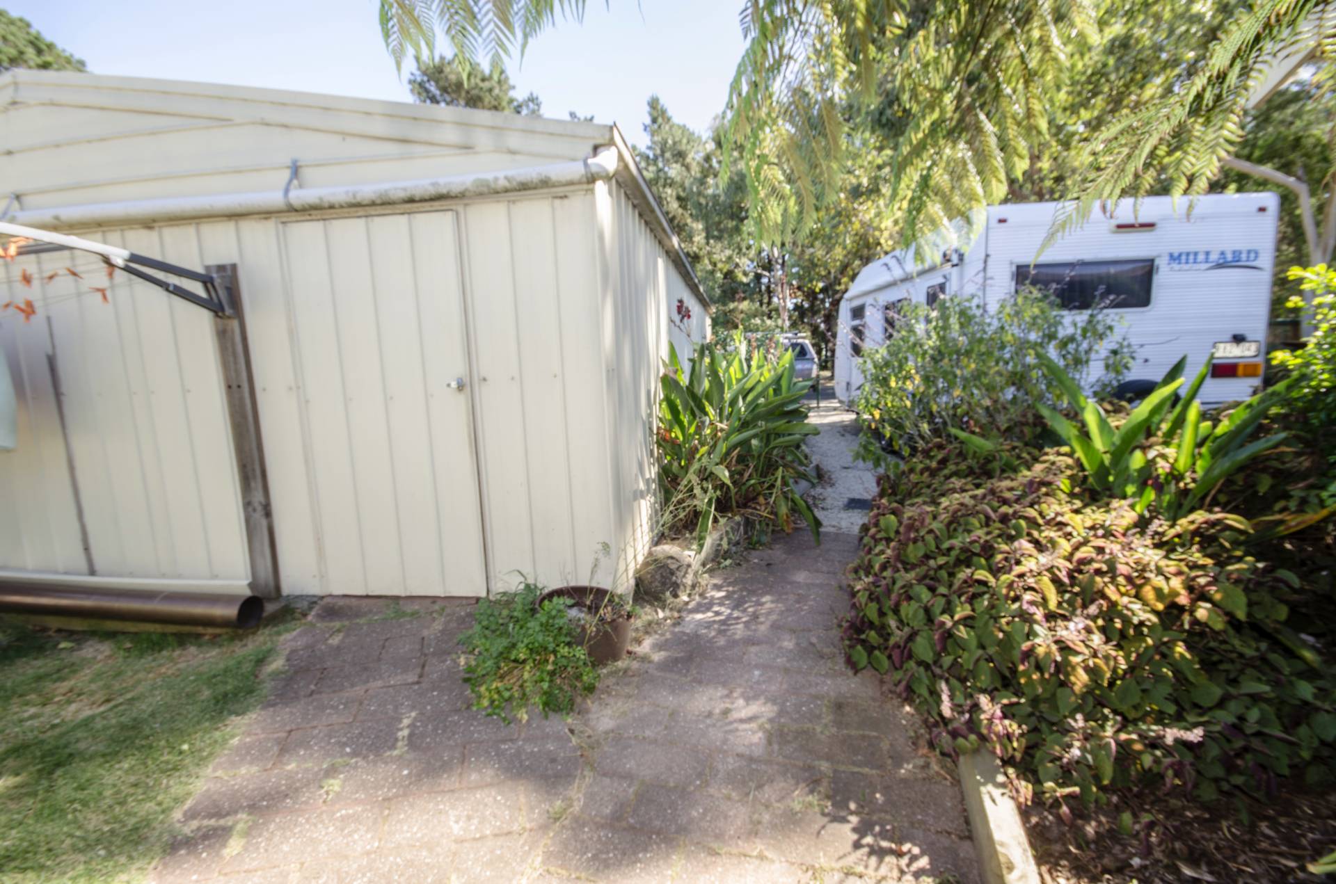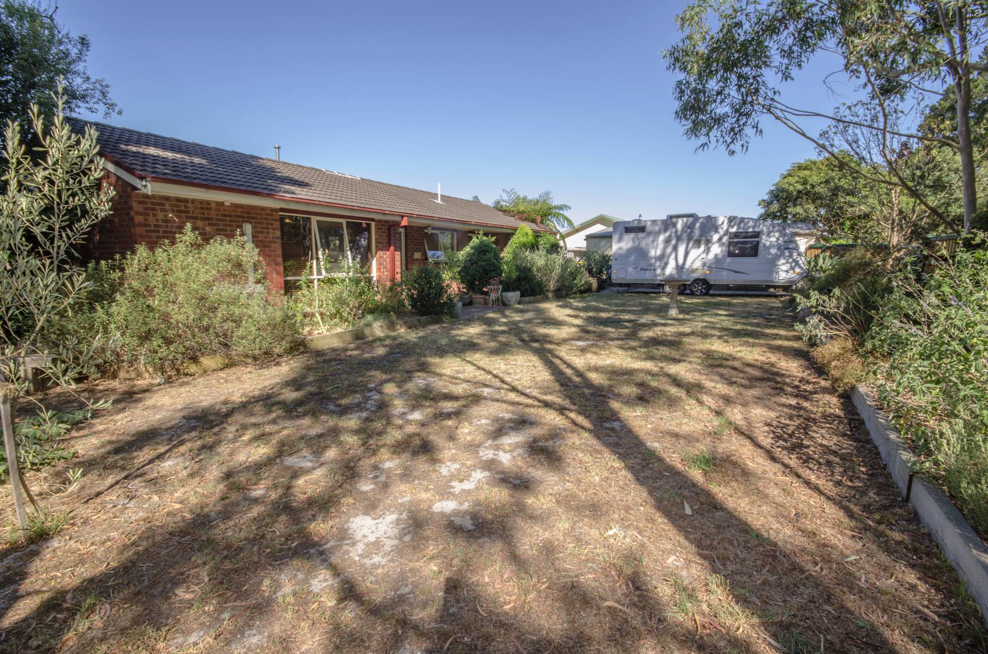 High fences, beautifully established gardens, veggie patch, water feature and water tanks for the gardens. Carport and dual access to property, room for truck, caravan or boat.