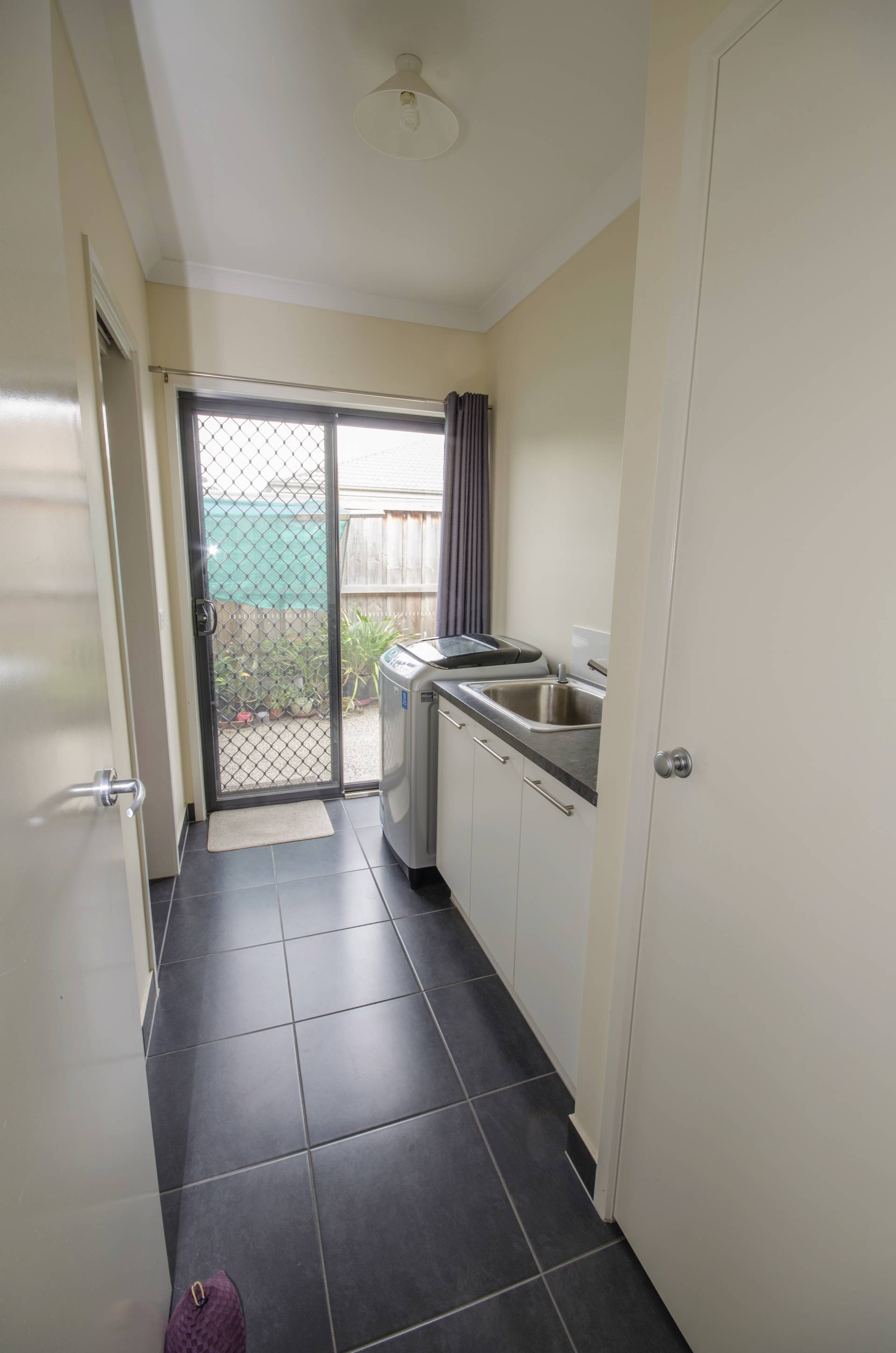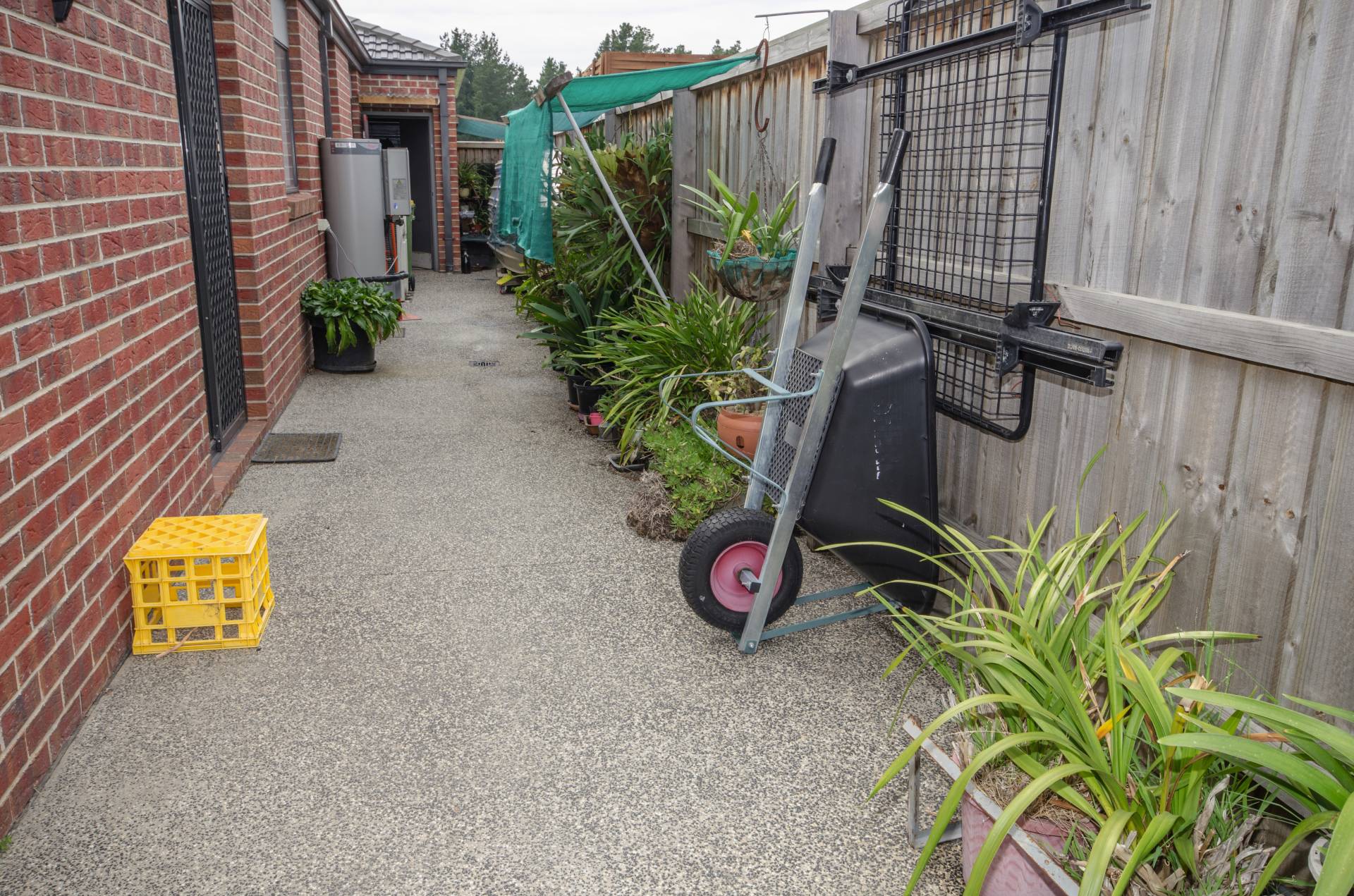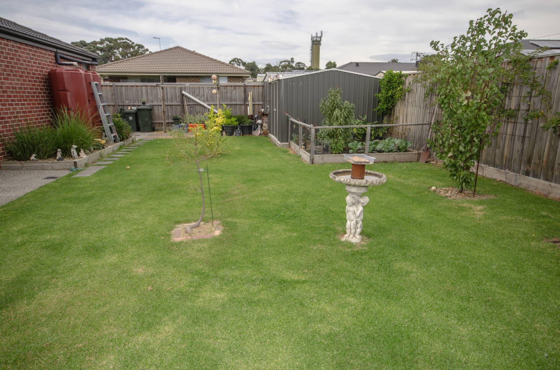 An internal door from house leads out to the dual car garage under roof line with remote controlled door.  Side gates to backyard with two tool sheds, established gardens and fruit trees watered with the new water tank.