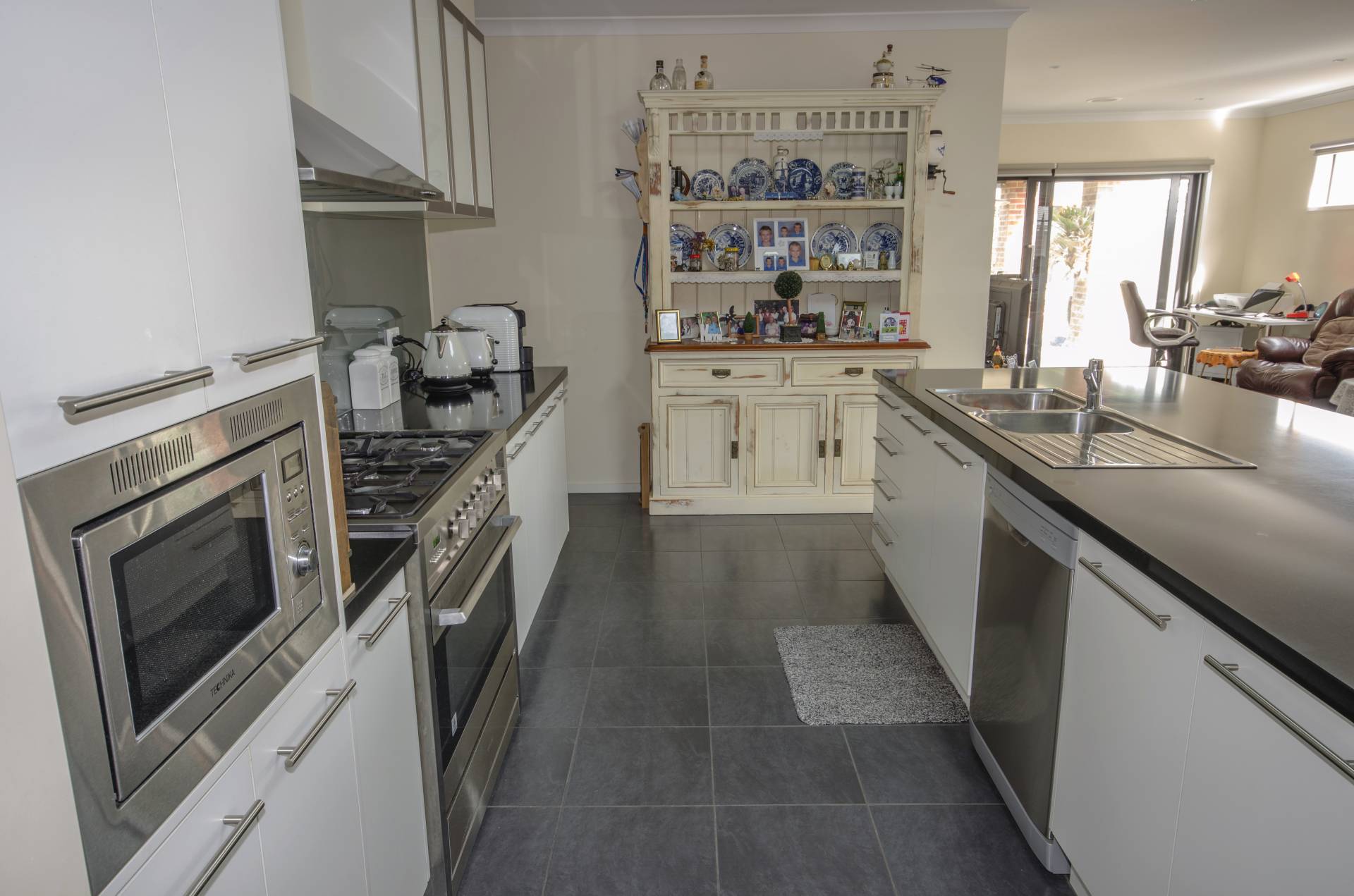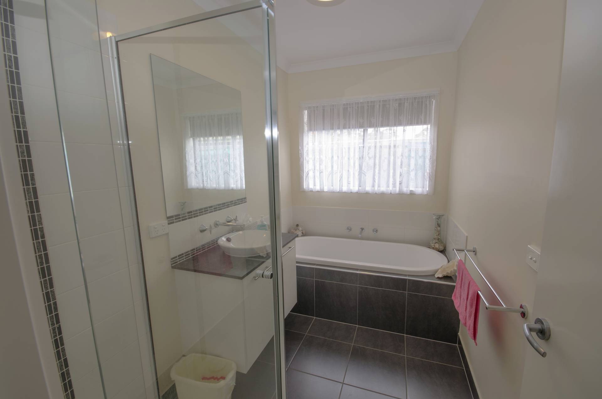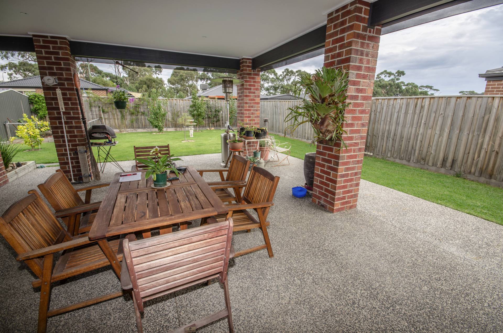 An internal door from house leads out to the dual car garage under roof line with remote controlled door.  Side gates to backyard with two tool sheds, established gardens and fruit trees watered with the new water tank.