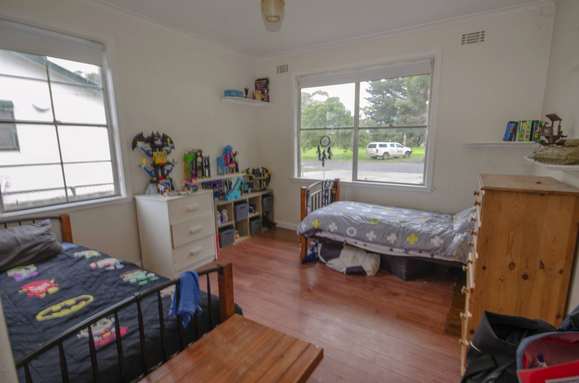 Timber look alike flooring in living areas, timber flooring in bedrooms.