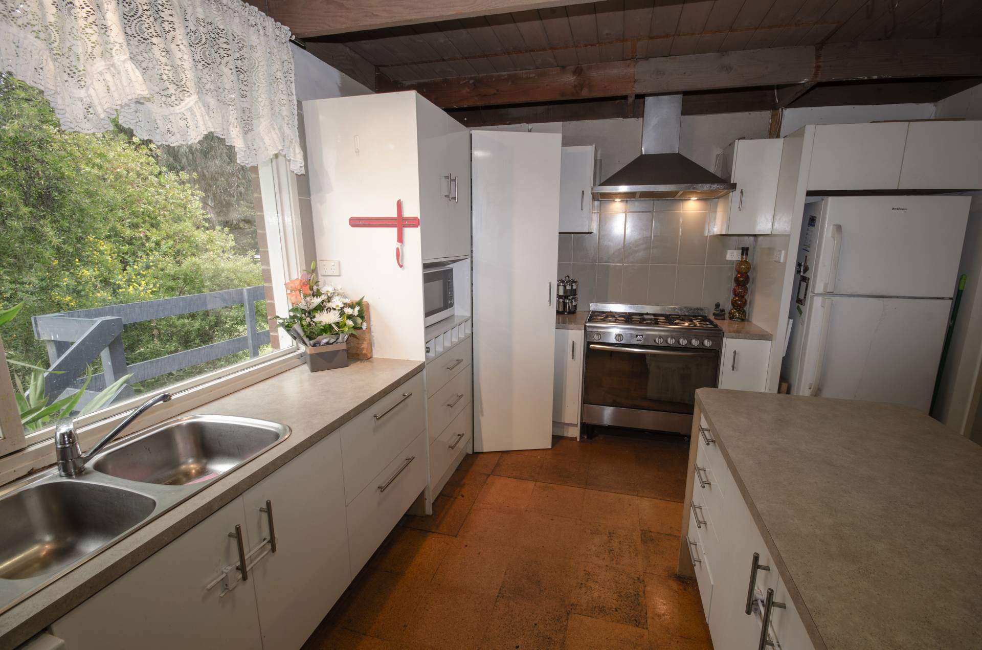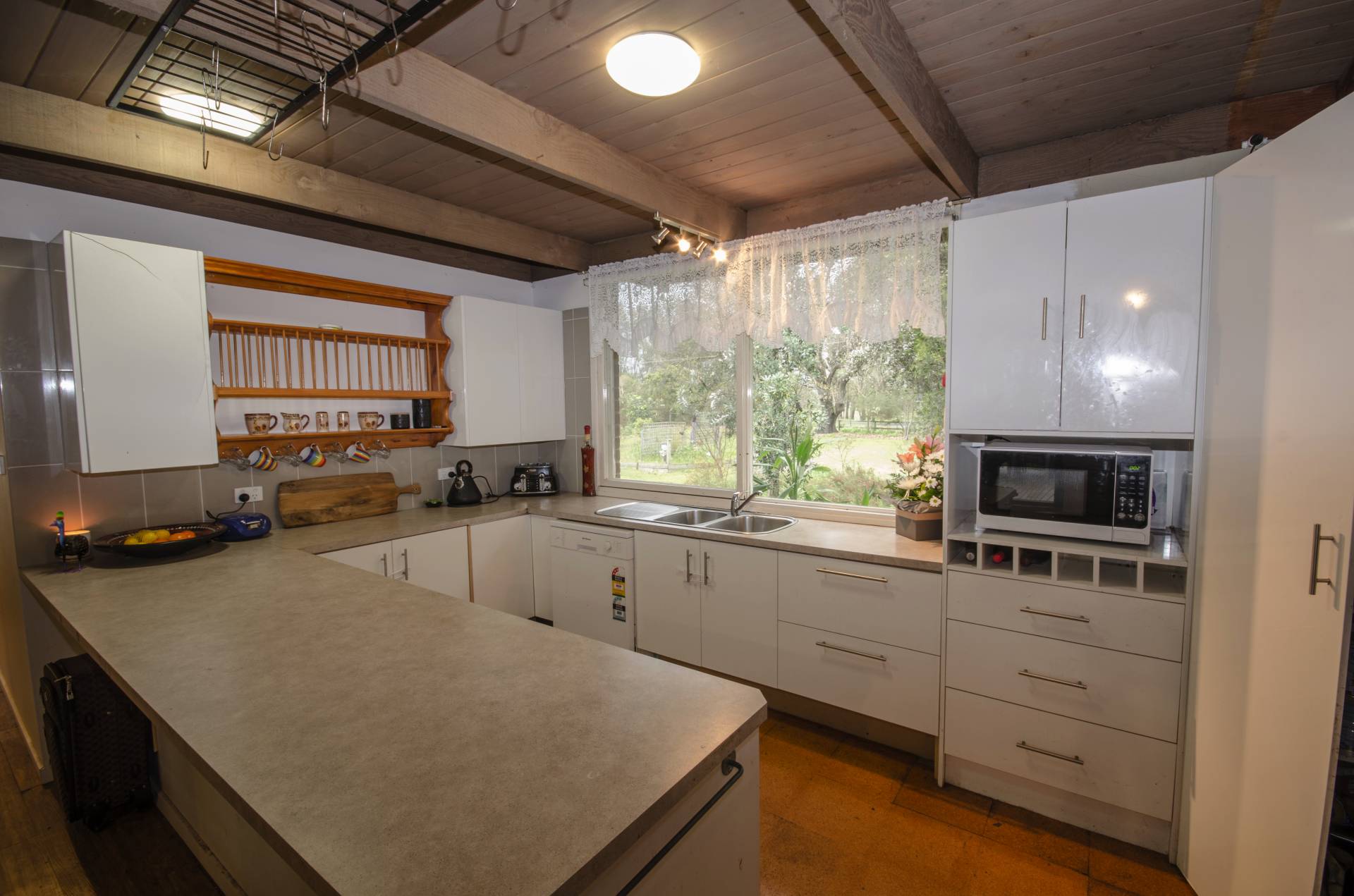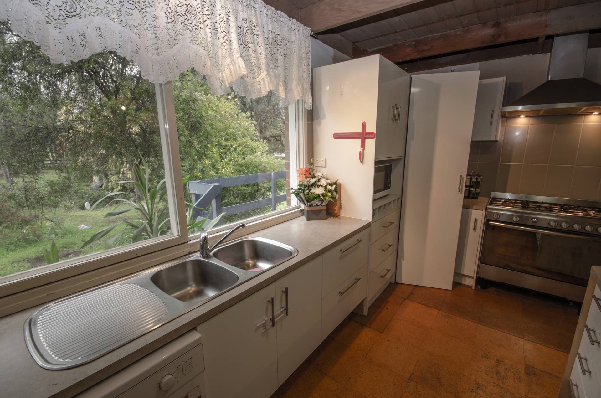 Modern kitchen, featuring Omega Stainless Steel Stove, 5 burner hot plate, plenty of cupboard space and large bench space. Generous sized meals/family room. The lounge room has a wood heater and stainless steel ceiling fan.