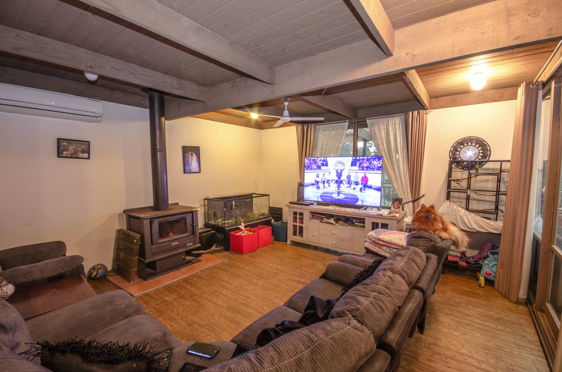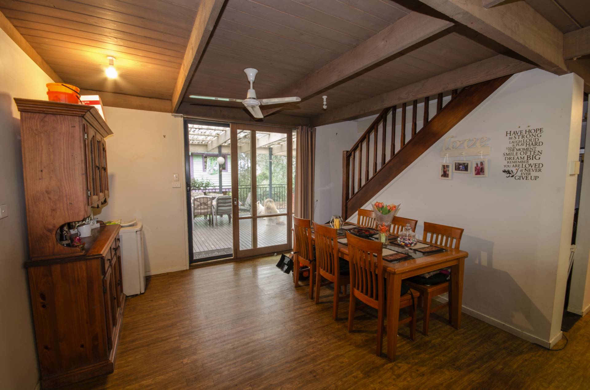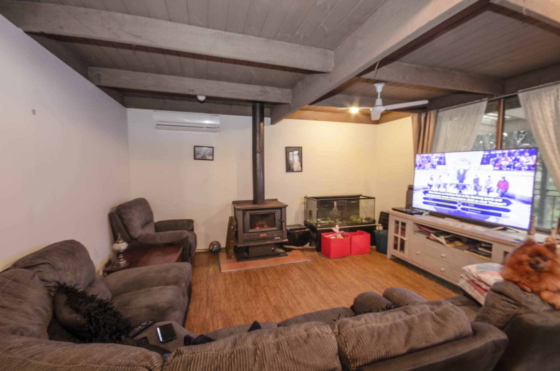 Modern kitchen, featuring Omega Stainless Steel Stove, 5 burner hot plate, plenty of cupboard space and large bench space. Generous sized meals/family room. The lounge room has a wood heater and stainless steel ceiling fan.
