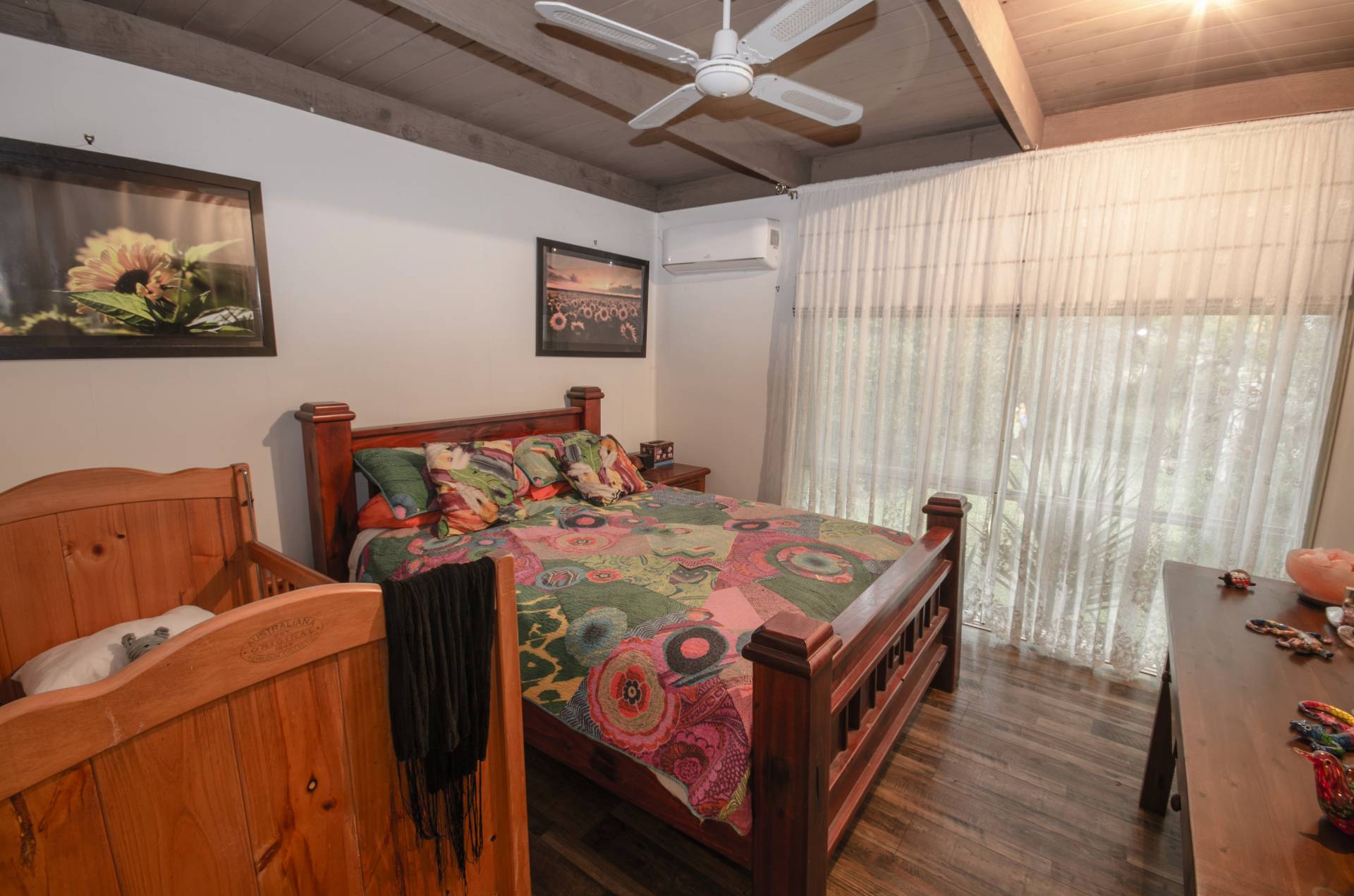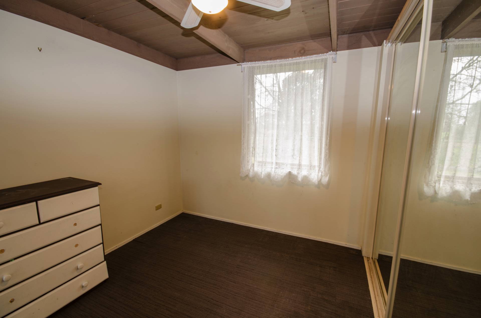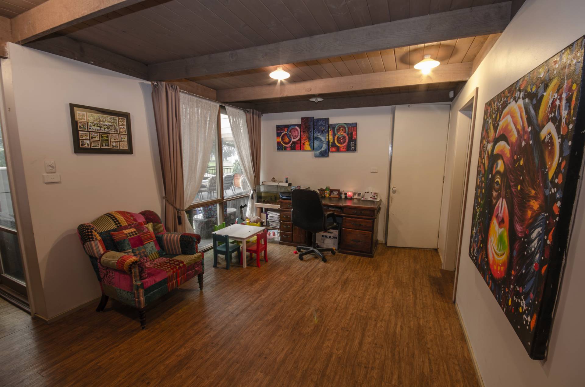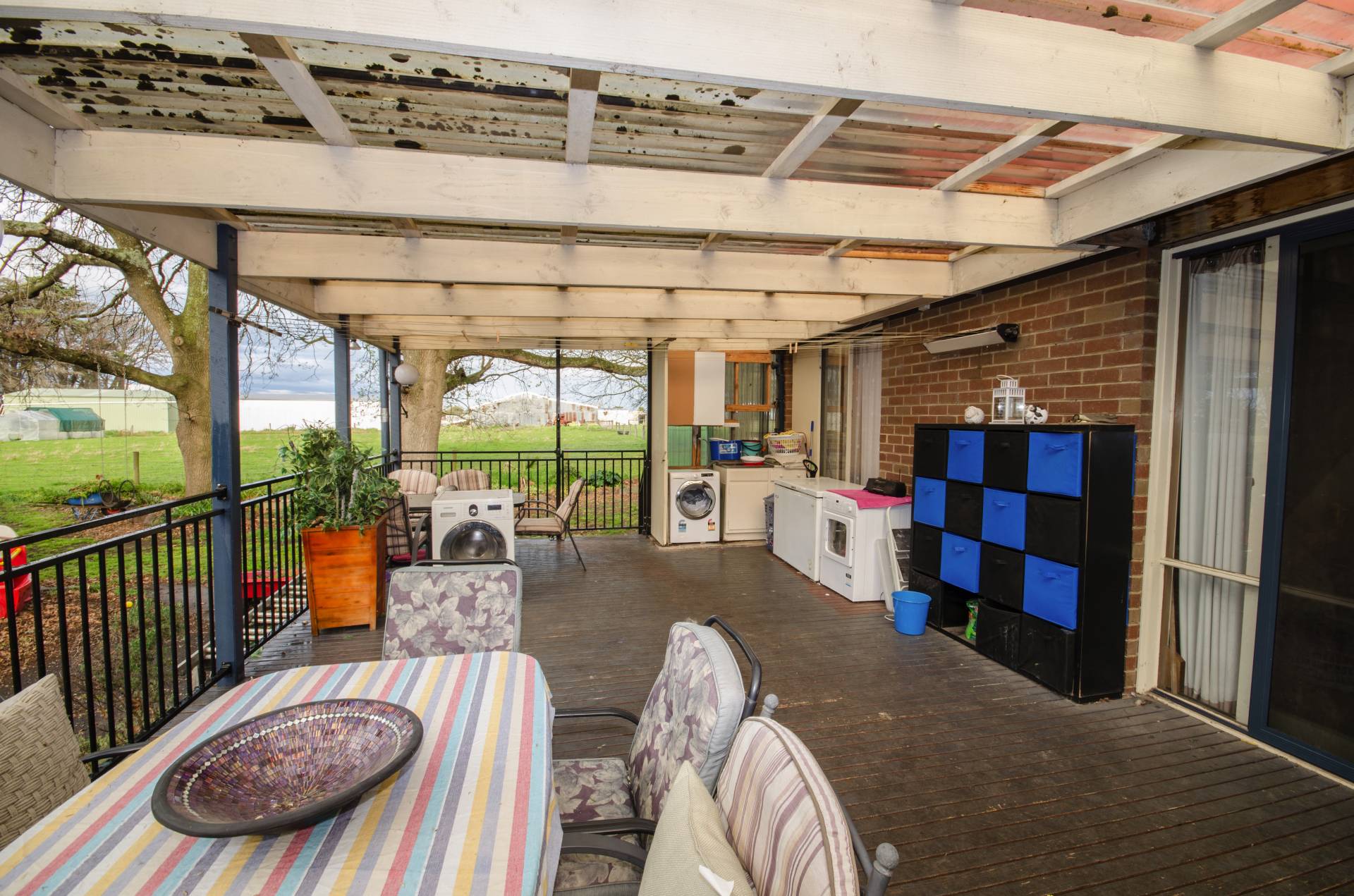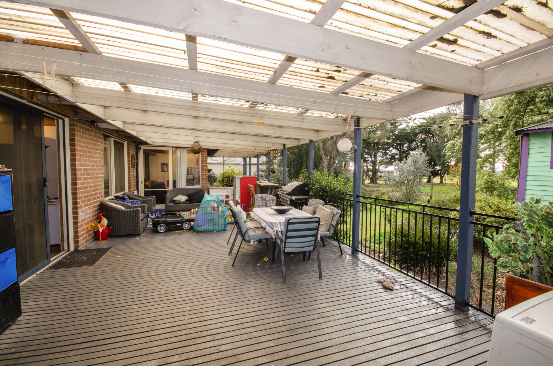 Two door access to 10 squares of under cover decked pergola with a view of back garden and paddock.