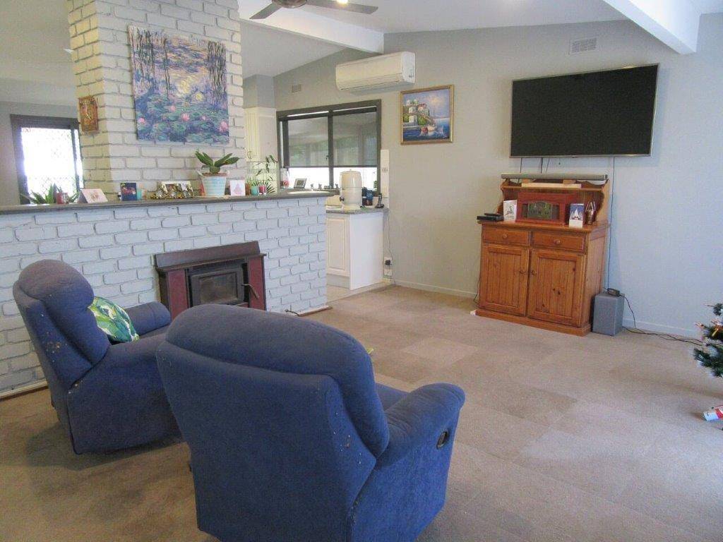 The interior has been freshly painted and partly renovated, with a light and bright kitchen offering pot drawers, stainless steel appliances, electric oven with gas cooktop, double sink, coffee nook and two pantries. There is a feature brick mantle in the lounge that houses a wood heater, the stainless steel ceiling fans and the split system in the living area also help to keep the house at desired temperatures. The family bathroom is spacious and modern with double vanities, double shower recess including two shower heads and all new tiling. A separate laundry with extra storage space is in a handy position. The bedrooms all have carpet and high ceilings, with the master bedroom including a walk in robe, ceiling fan, and the sizeable ensuite with corner spa and separate shower is also modern and spacious. A large bay window offering a lovely rural outlook, and a sliding door to the outside rear deck both let in lots of natural light. Off the kitchen area is a sliding door to the undercover outside deck with enough space for the bbq and entertaining, or you can sit and enjoy a cuppa whilst watching the sun set and listen to the birds. There is enough room in the fully enclosed carport to fit two four wheel drive sized cars, the high roof making it the ideal place to securely store the boat or caravan, and the shed will comfortably hold another two vehicles. There is gated access along the other side of the house and the yard is fully fenced all around.