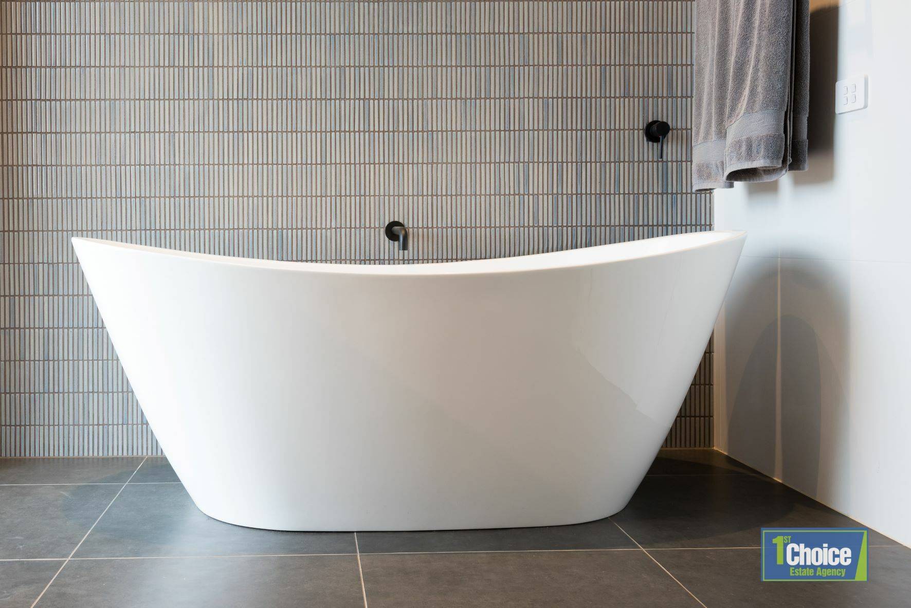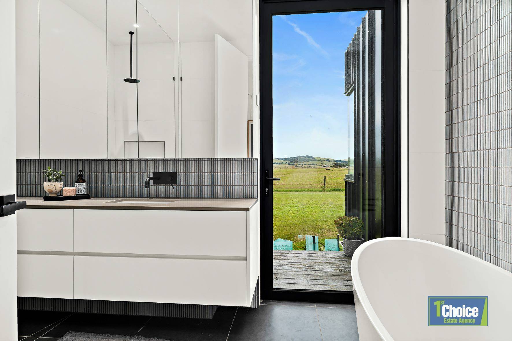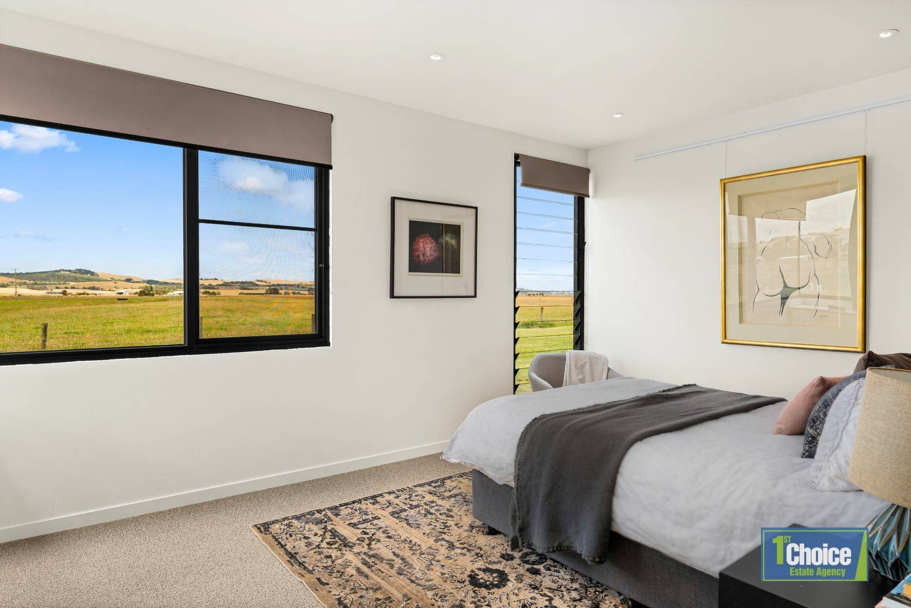 The master bedroom has a unique feature wall, built-in wardrobe, and expansive views of the rolling hills of Woolamai and San Remo. The ensuite has a walk-in door less shower, cascade showerheads and two-sink vanity.