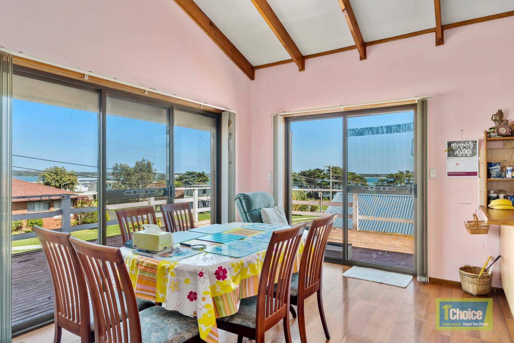 Upper Level:  Vaulted ceilings in family lounge with south east & westerly views (note: deck is in need of repair).  Open plan kitchen and dining, 3 bedrooms, family bathroom, ample storage cupboards.