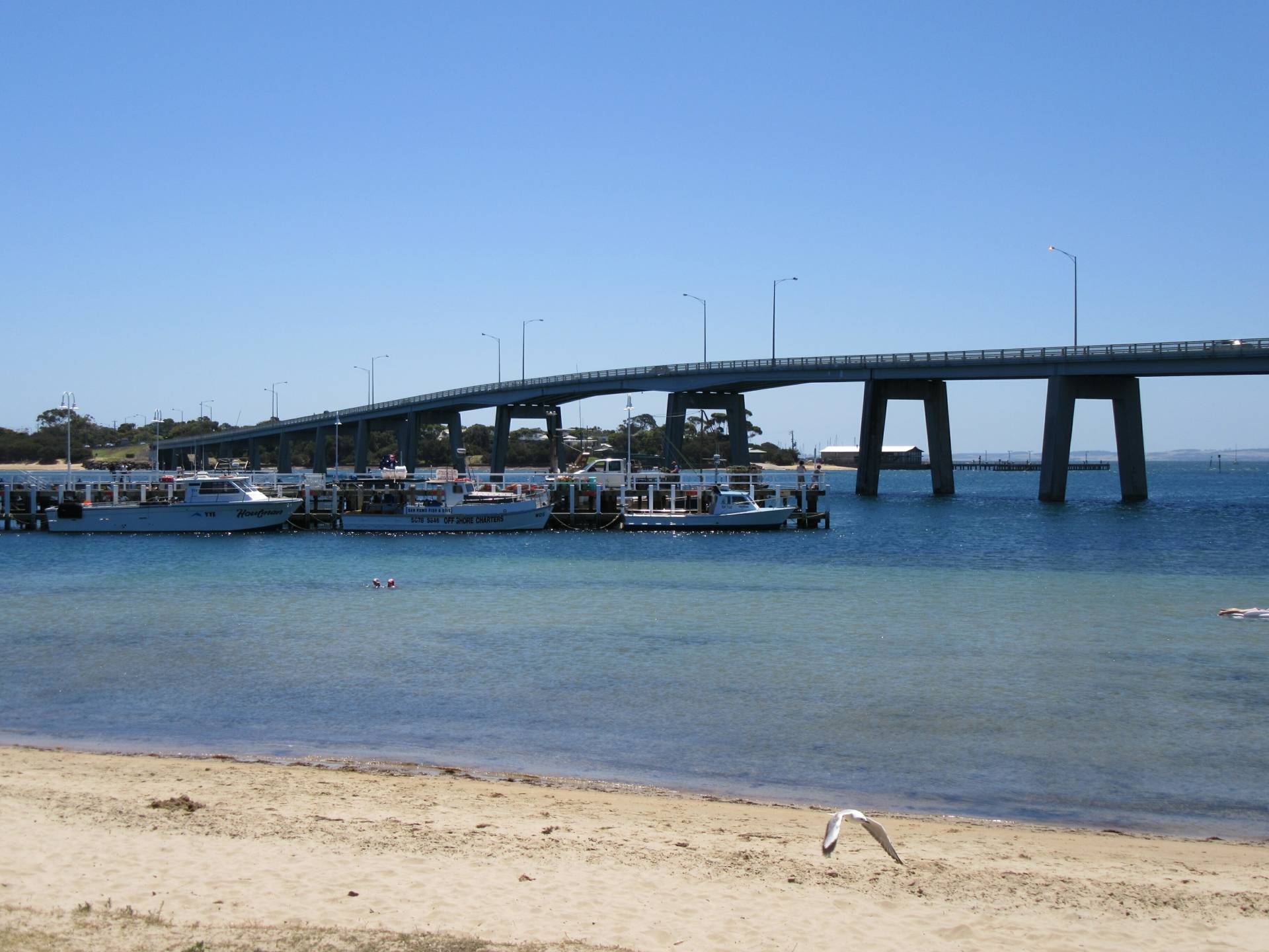 • The village of San Remo at the base of the bridge surrounded by Westernport Bay with a commercial fishing fleet moored at the jetty, an array of cafes, hotels, supermarket and restaurants and a children’s park