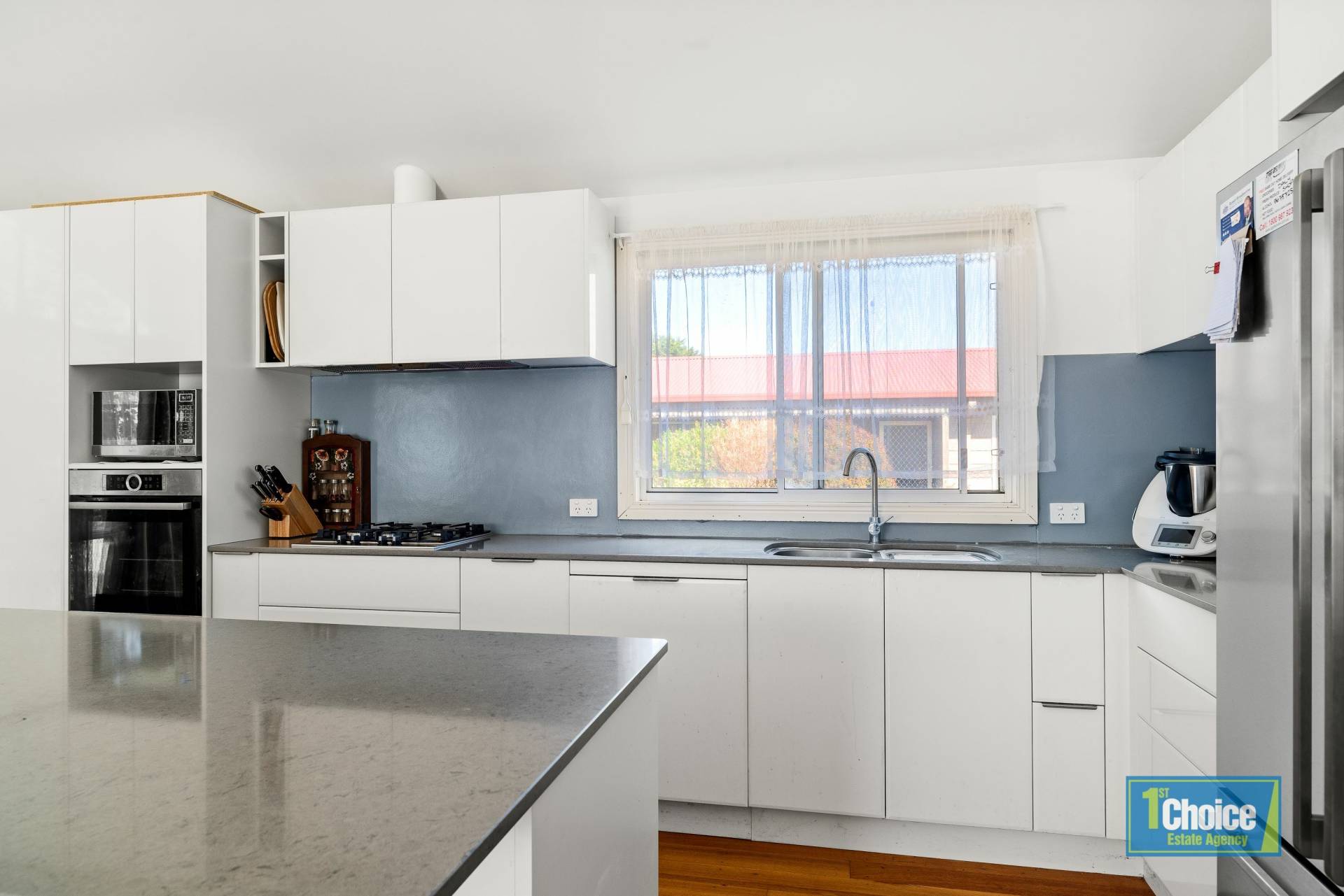 Featuring an open plan concept with living, meals and kitchen.  The kitchen is well appointed with integrated dishwasher, rubbish tidy, plenty of overhead cupboards, soft closing drawers, large double door pantry, electric oven, gas cook top and island stone caesar benchtop this kitchen caters for great entertaining.  The 3 bedrooms all with b/i/r’s are serviced by a modern family bathroom.