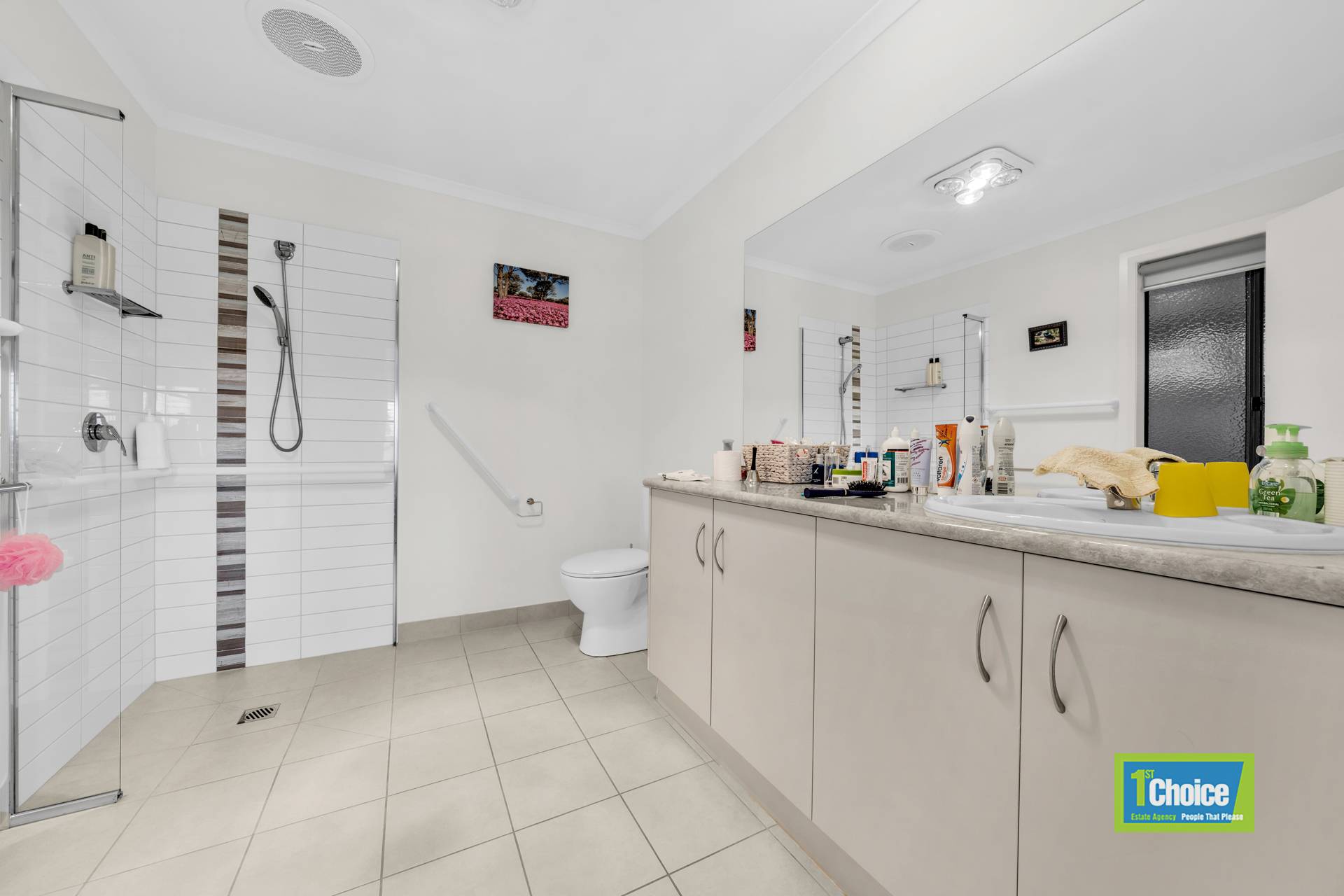 At the front of the home is the master bedroom complemented by plantation shutters, ceiling fan, walk-in robe and large en-suite with seamless shower recess giving easy access for wheelchair or those needing a chair to sit to shower.