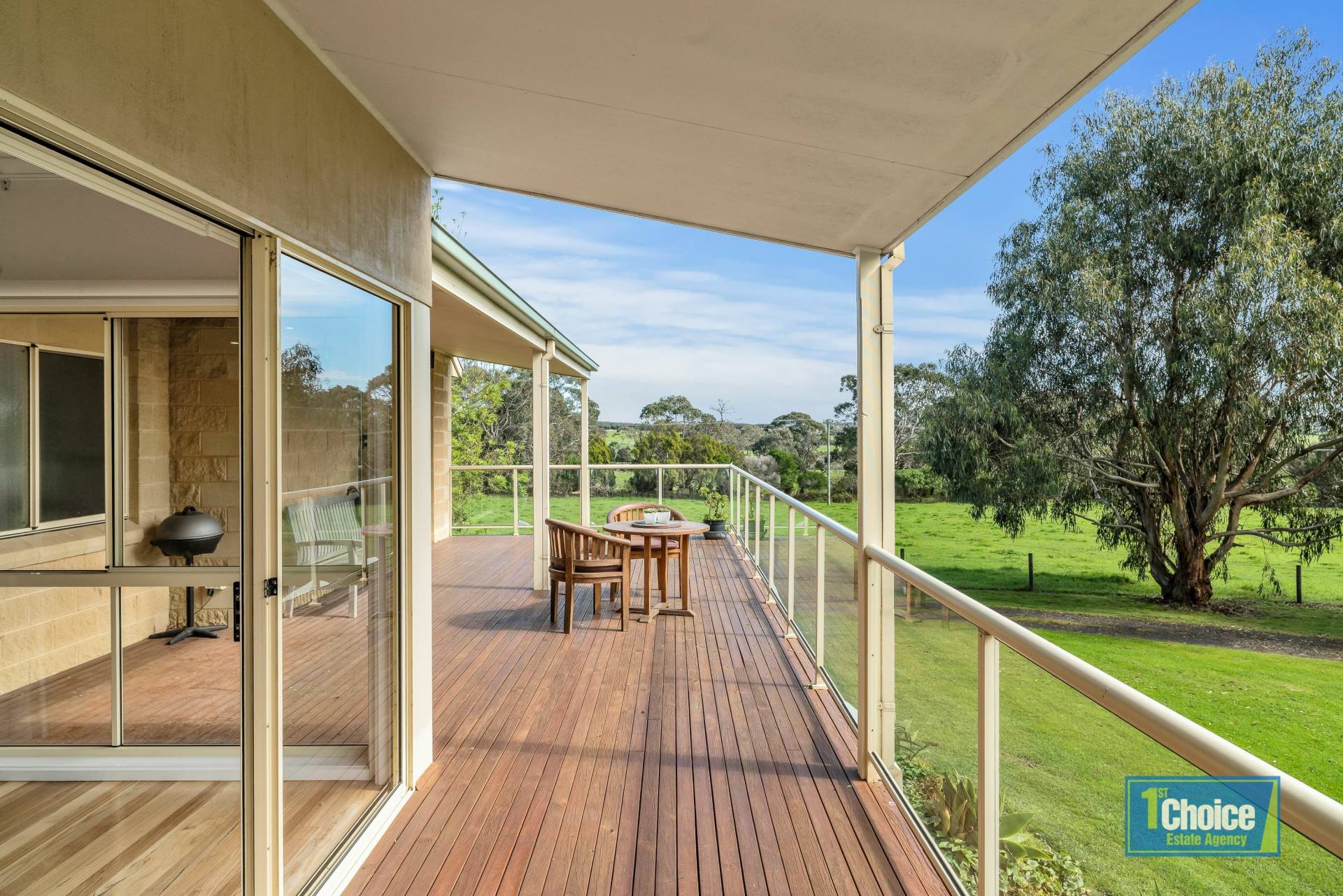 The olive tree lined driveway that leads up to this architecturally designed 40sq north facing home focusing on the expansive living zones and high wideset roofed decked balcony’s is a real entertainer’s opportunity.  The home yard is established and well sheltered, with mature trees and is thoughtfully positioned to provide a great vantage point to overlook the 3 workable paddocks each with mains water connected, electric boundary fence and loading stockyard. A new shed/workshop with large electric roller door, conveniently positioned for easy access.
