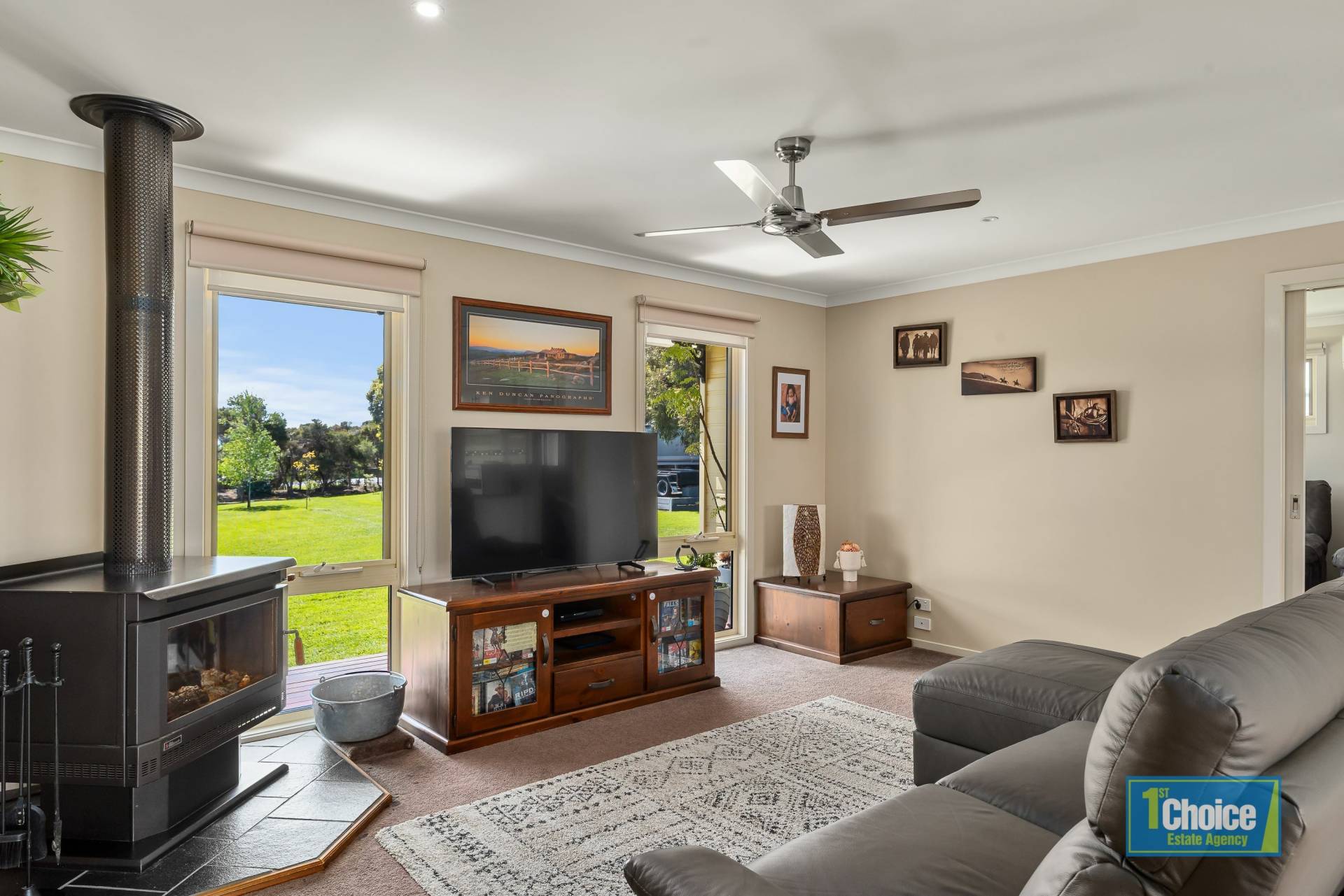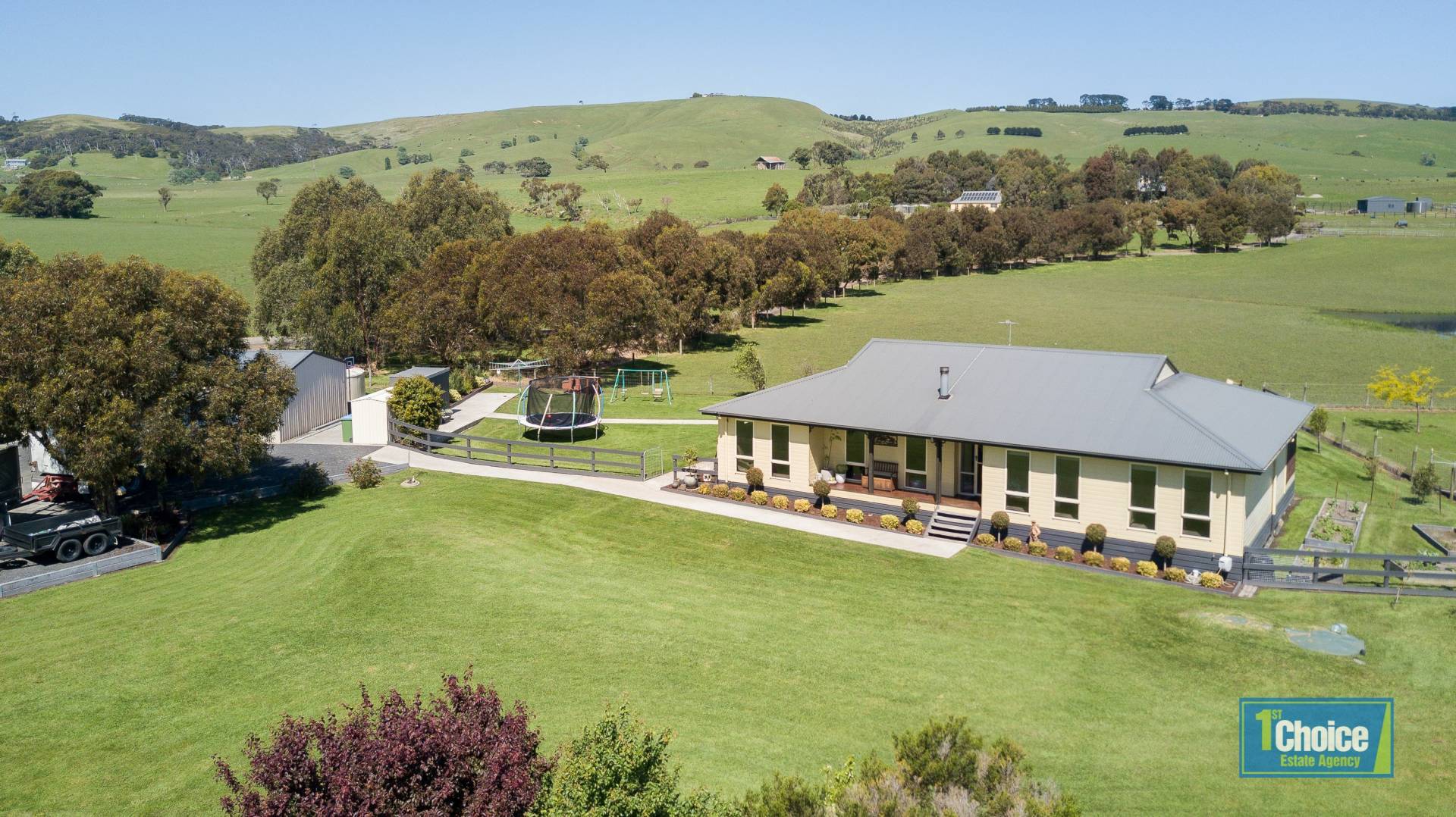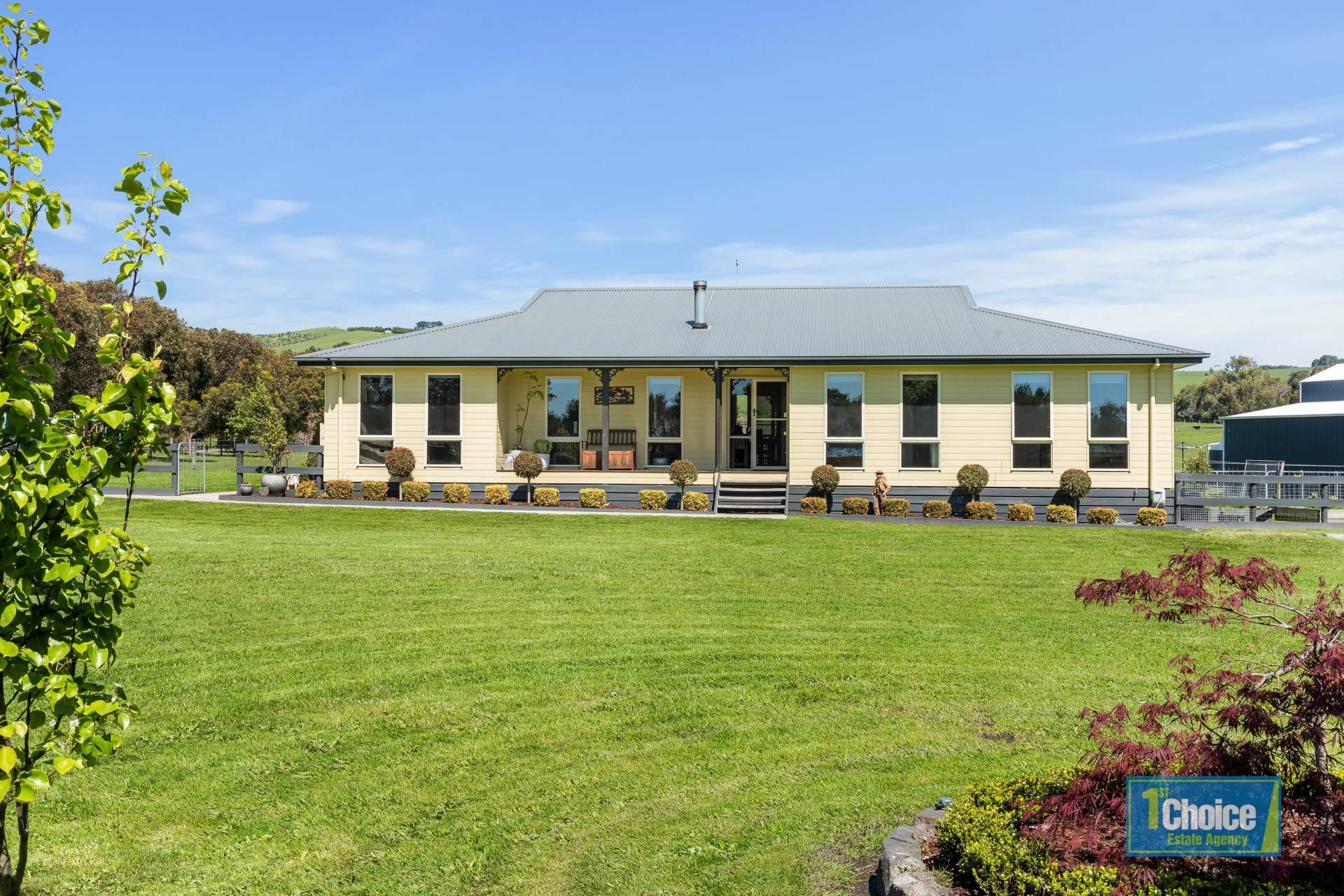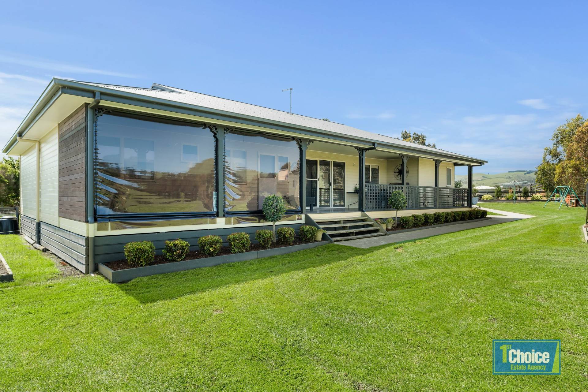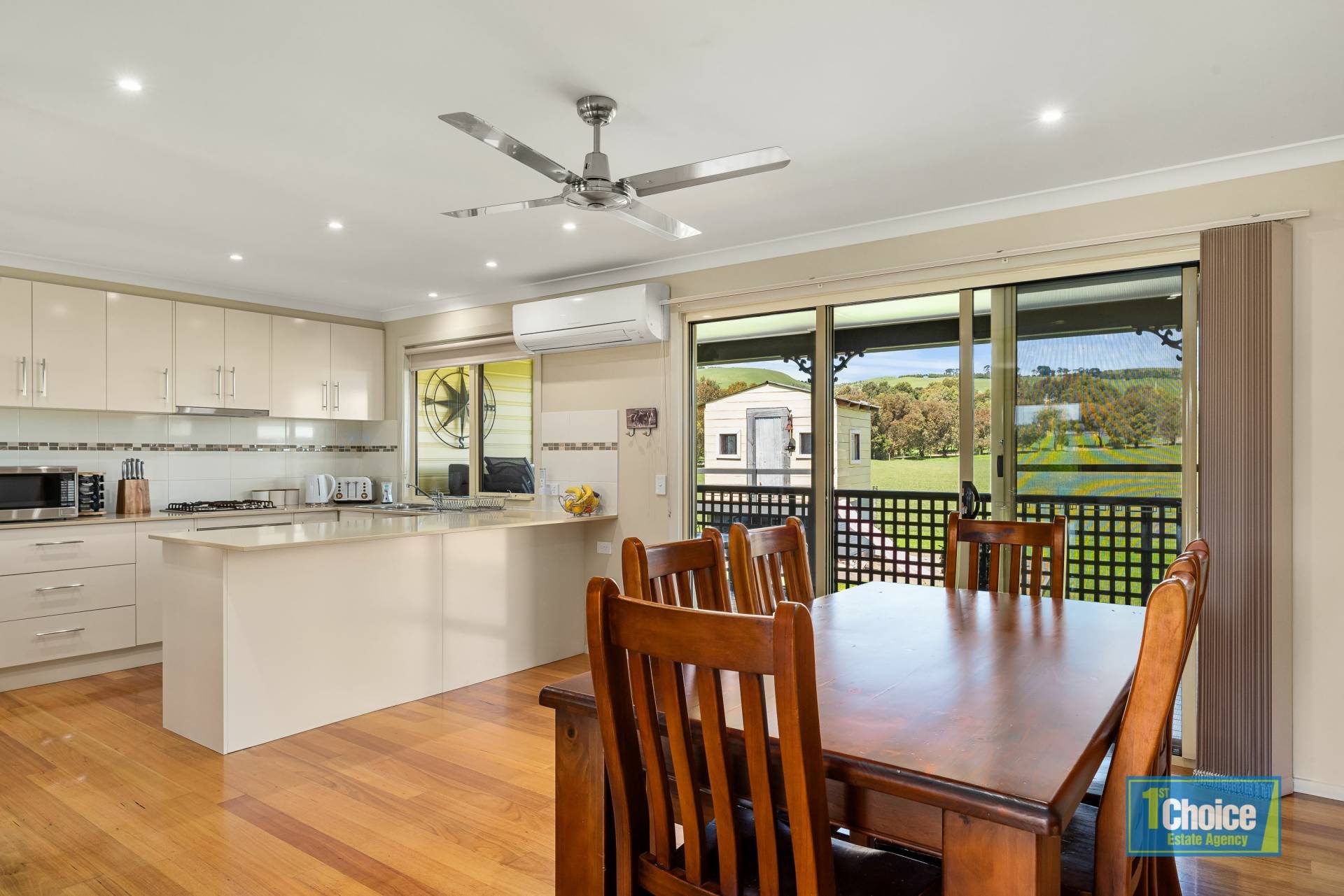 The layout of this home is ideal for the growing family.  The open plan concept of living, meals and kitchen is the heart of the home which flows out to the undercover entertainment area with café blinds for all season entertaining. The kitchen is complemented by stone island bench, gas cooking, dishwasher, rangehood, overhead cupboards, plenty of drawers and pantry.   Enjoy cooking or your morning coffee whilst being memerized by the scenic views of the rolling hills and farmland. The living area has a cosy wood fire for those cold winter nights, and there is a reverse cycle air conditioner in the meals area for all year temperature control.  A second living zone offers privacy or quiet movie nights and also has heating and cooling.  The home boasts 4 generous size bedrooms, 3 with b/i/r/s and ceiling fans and are serviced by the family bathroom and separate toilet , the master bedroom featuring walk-in-robe, ceiling fan and ensuite.  The laundry is of good size and has access out to back veranda.  Additionally you will find a spacious double garage plus workshop with concrete flooring, 2 garden sheds and wood shed.  The compacted driveway allows for heavy vehicles up to 60 tonne.   The 3 large water tanks (22,500 litres) gives sufficient water for families.   With lots of space for outdoor activities on this huge block, the kids can kick the ball and there is still areas for chooks and veggie gardens.