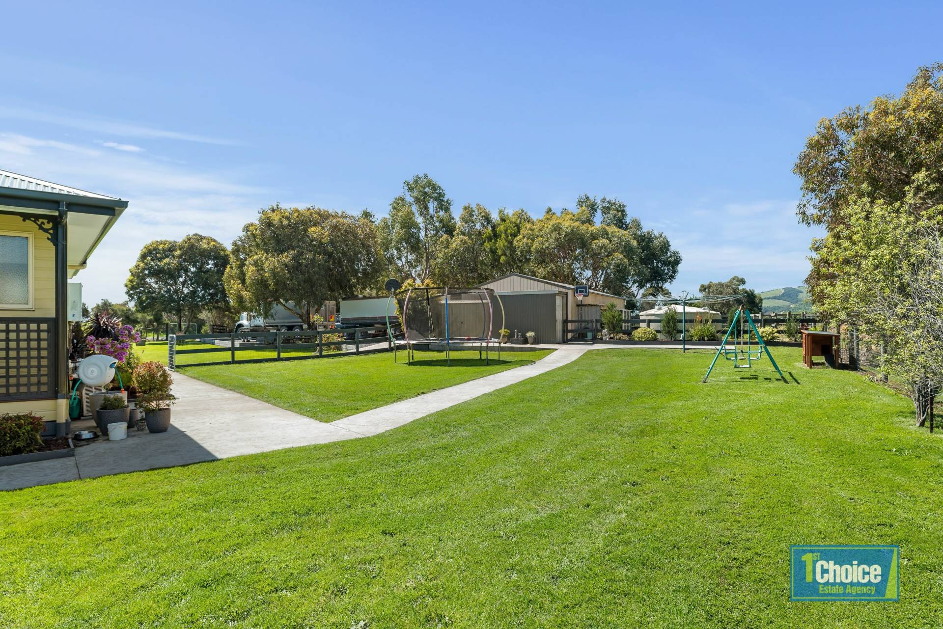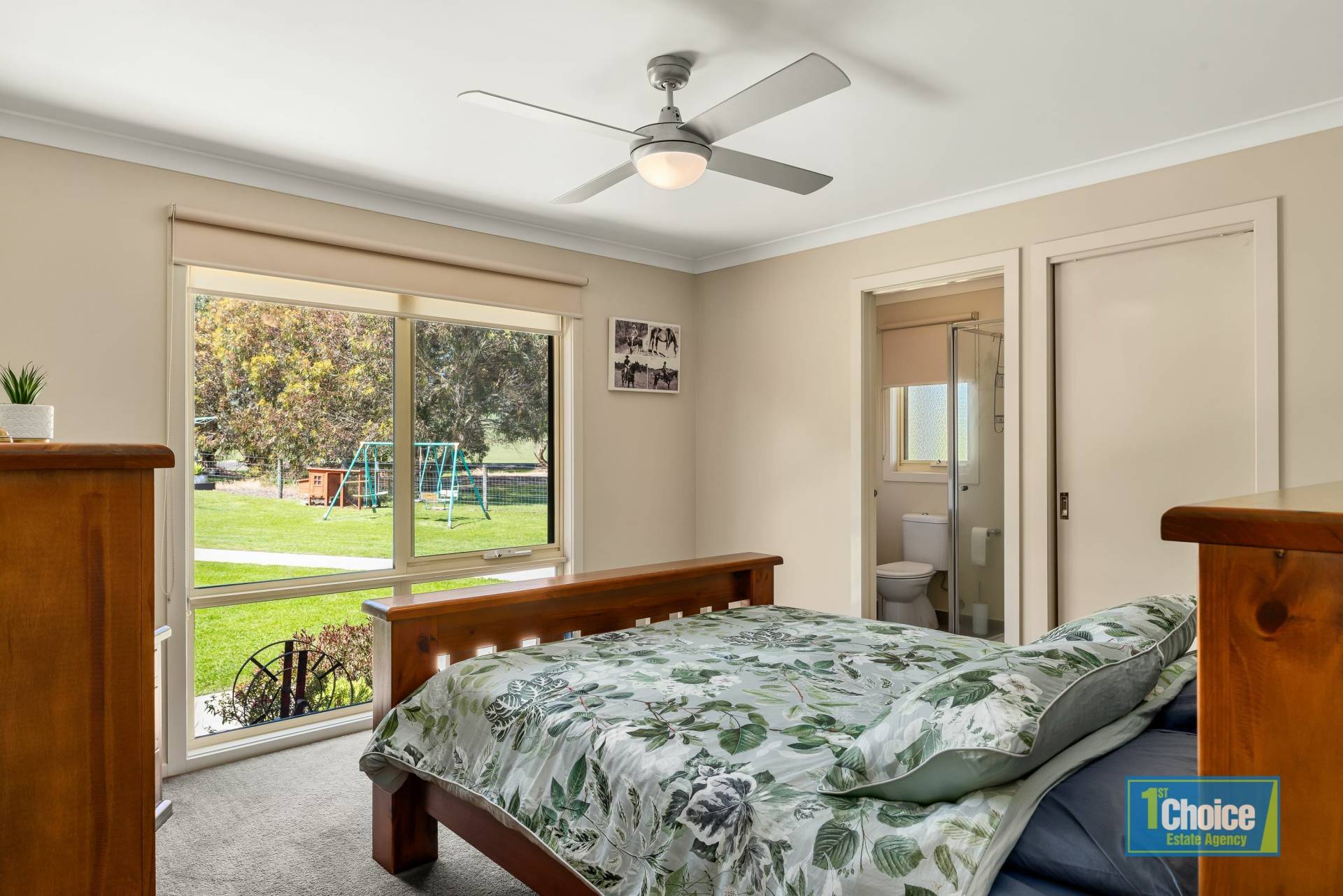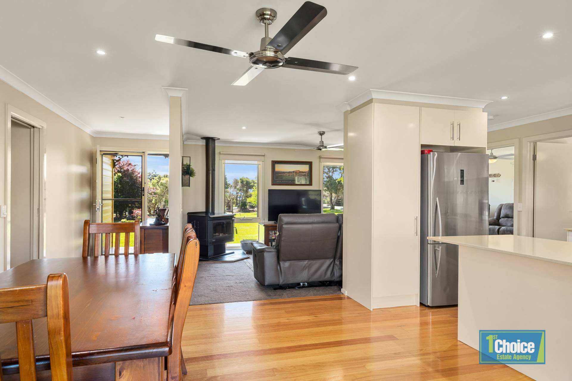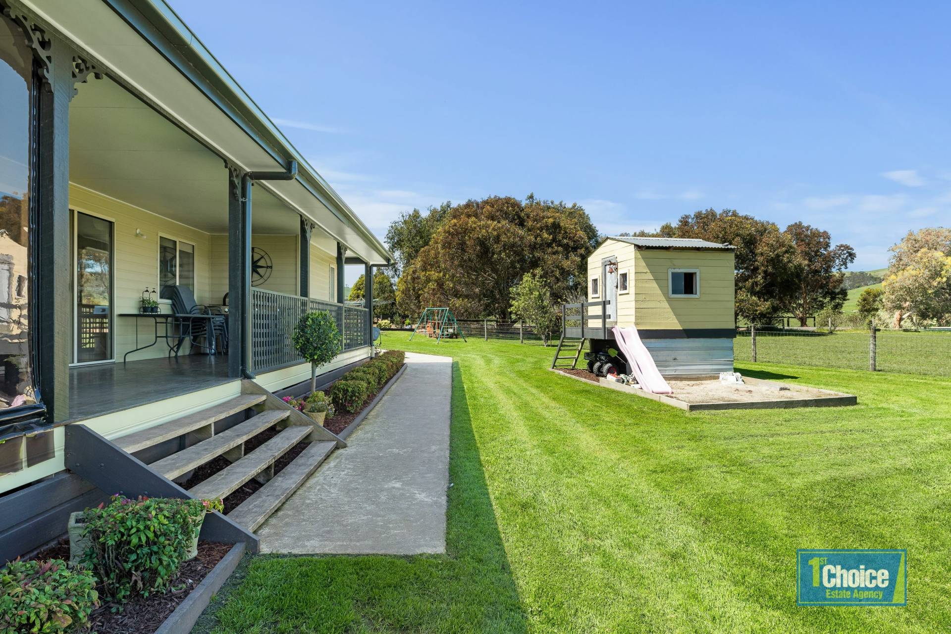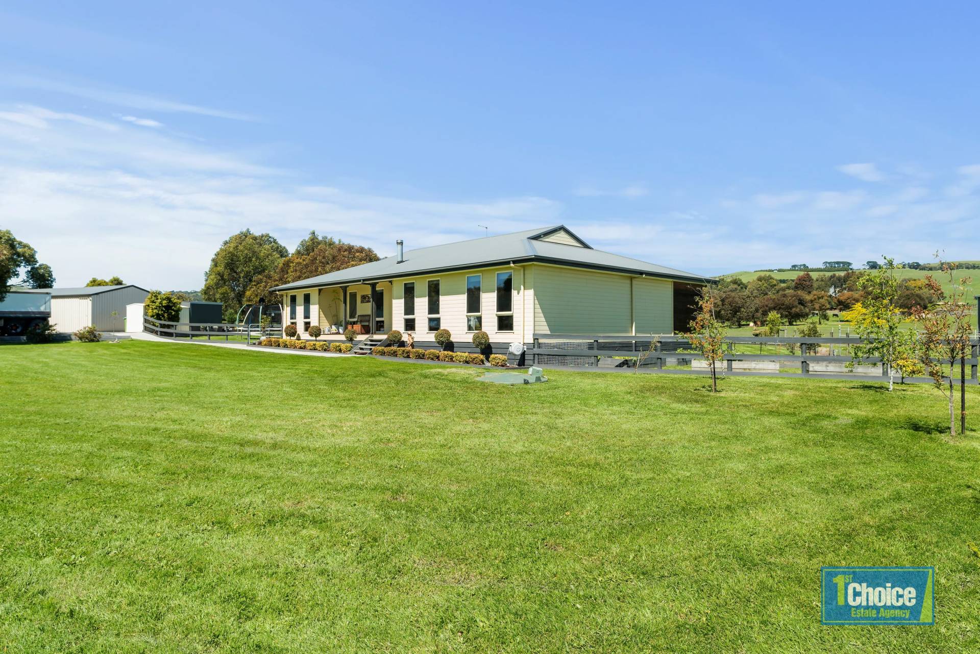 The layout of this home is ideal for the growing family.  The open plan concept of living, meals and kitchen is the heart of the home which flows out to the undercover entertainment area with café blinds for all season entertaining. The kitchen is complemented by stone island bench, gas cooking, dishwasher, rangehood, overhead cupboards, plenty of drawers and pantry.   Enjoy cooking or your morning coffee whilst being memerized by the scenic views of the rolling hills and farmland. The living area has a cosy wood fire for those cold winter nights, and there is a reverse cycle air conditioner in the meals area for all year temperature control.  A second living zone offers privacy or quiet movie nights and also has heating and cooling.  The home boasts 4 generous size bedrooms, 3 with b/i/r/s and ceiling fans and are serviced by the family bathroom and separate toilet , the master bedroom featuring walk-in-robe, ceiling fan and ensuite.  The laundry is of good size and has access out to back veranda.  Additionally you will find a spacious double garage plus workshop with concrete flooring, 2 garden sheds and wood shed.  The compacted driveway allows for heavy vehicles up to 60 tonne.   The 3 large water tanks (22,500 litres) gives sufficient water for families.   With lots of space for outdoor activities on this huge block, the kids can kick the ball and there is still areas for chooks and veggie gardens.