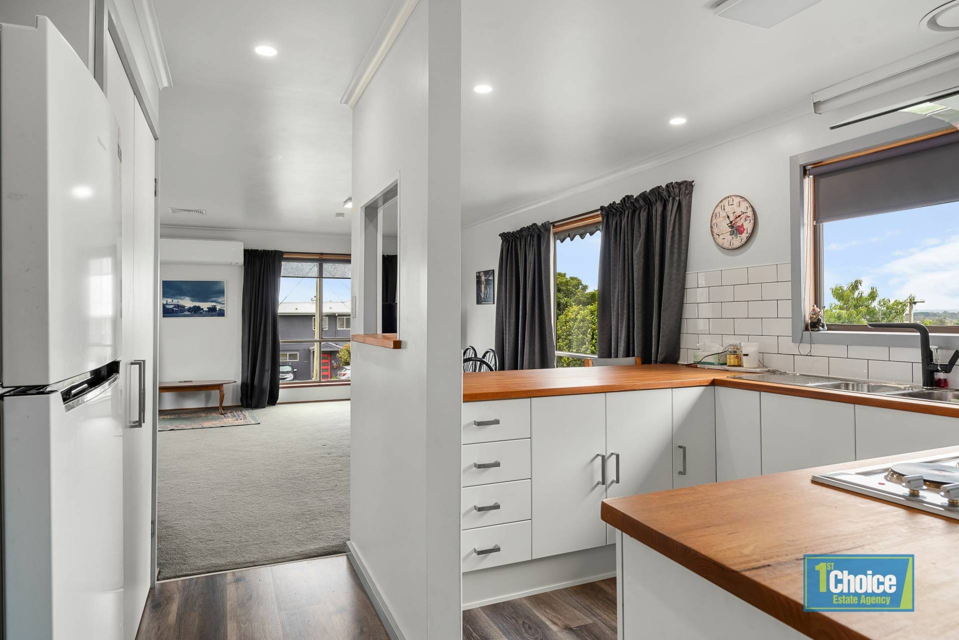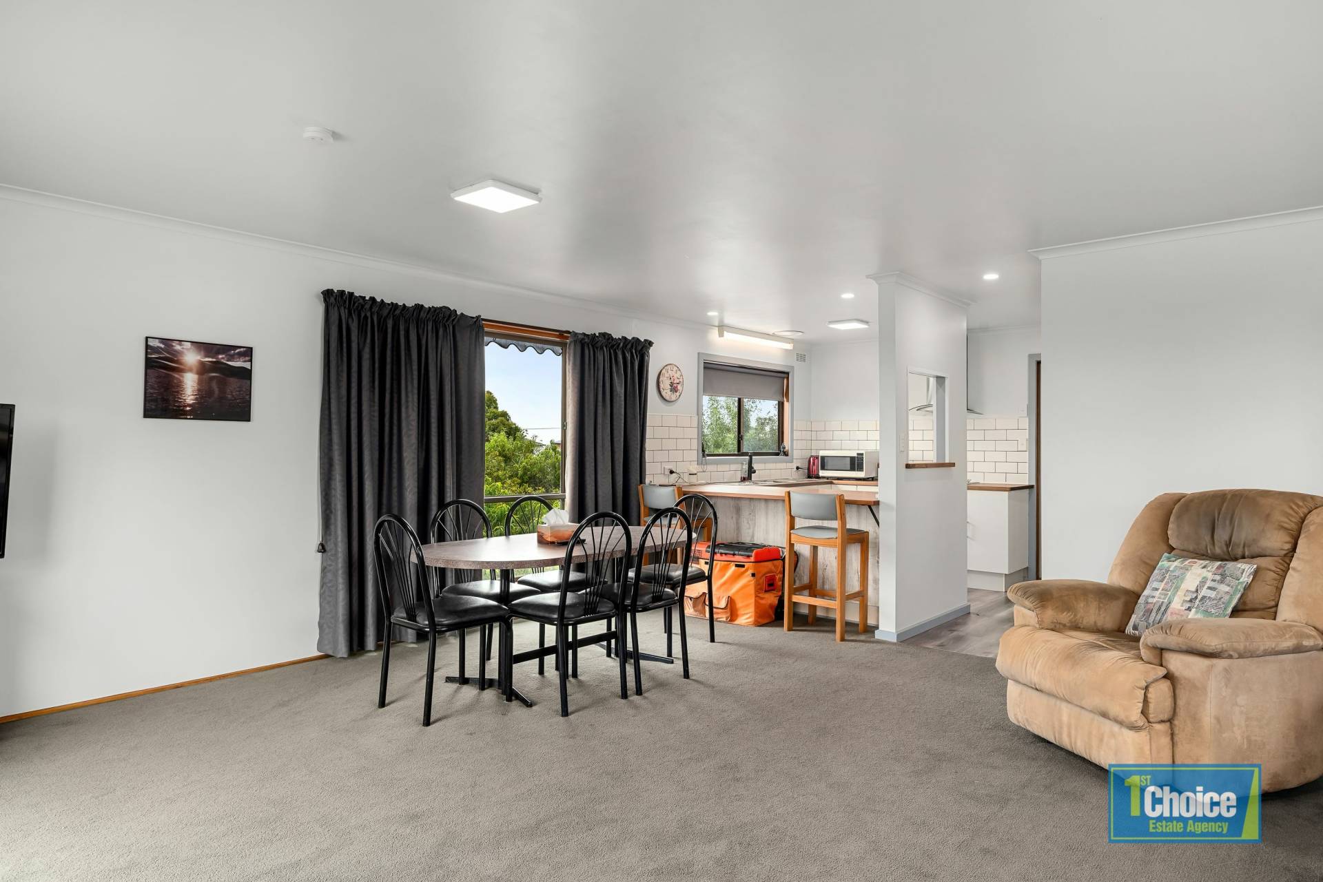 Upstairs you are greeted by the warm and inviting open plan living, dining and kitchen area.  The kitchen has been updated with electric cooking, rangehood, double door pantry and solid timber benchtop.  The living area is complemented by daylight blinds, split -system air conditioning and glimpses of French Island.  The other 2 generous size bedrooms both have new carpet and the master with full robes across wall and split-system air conditioning.