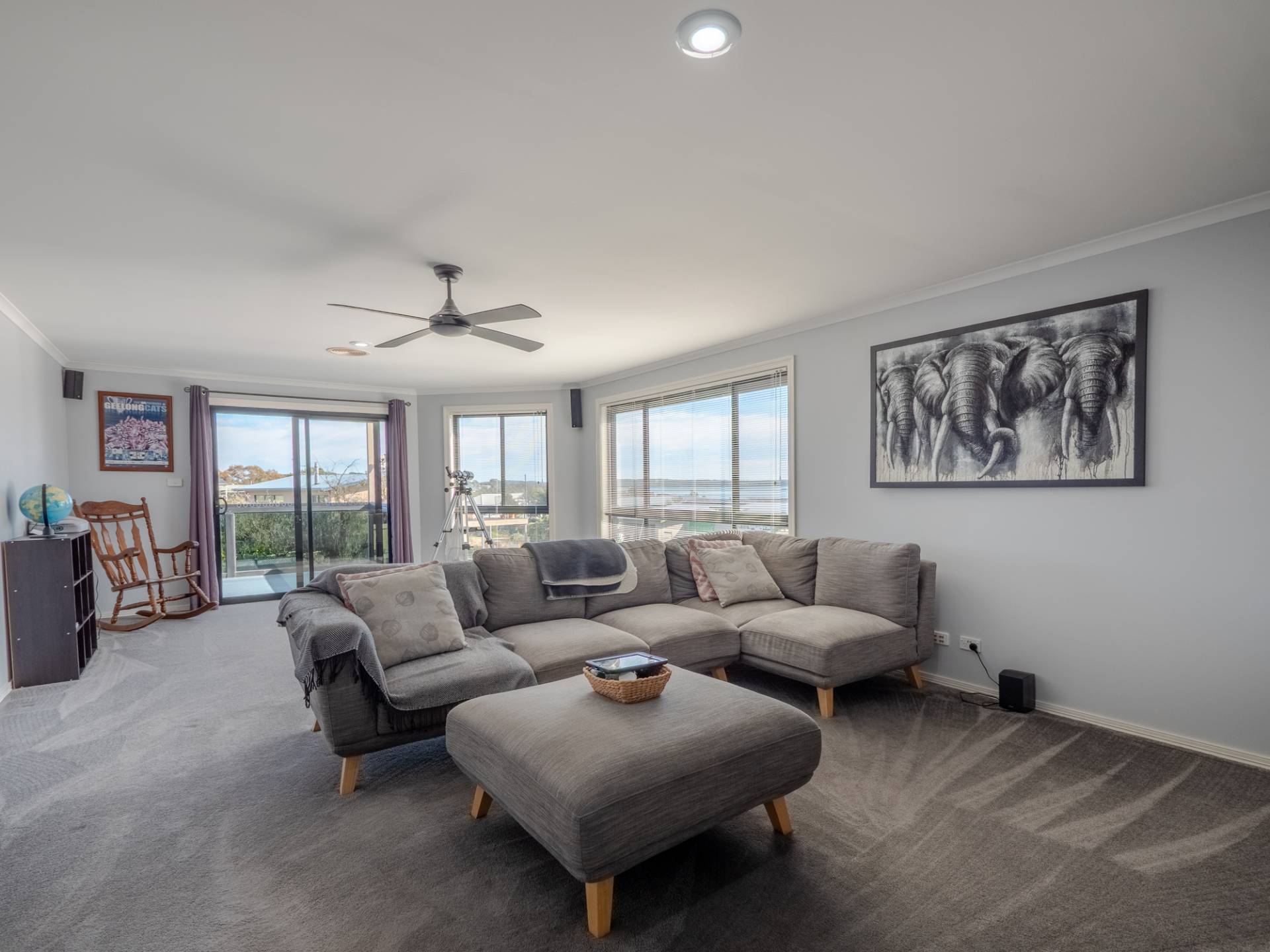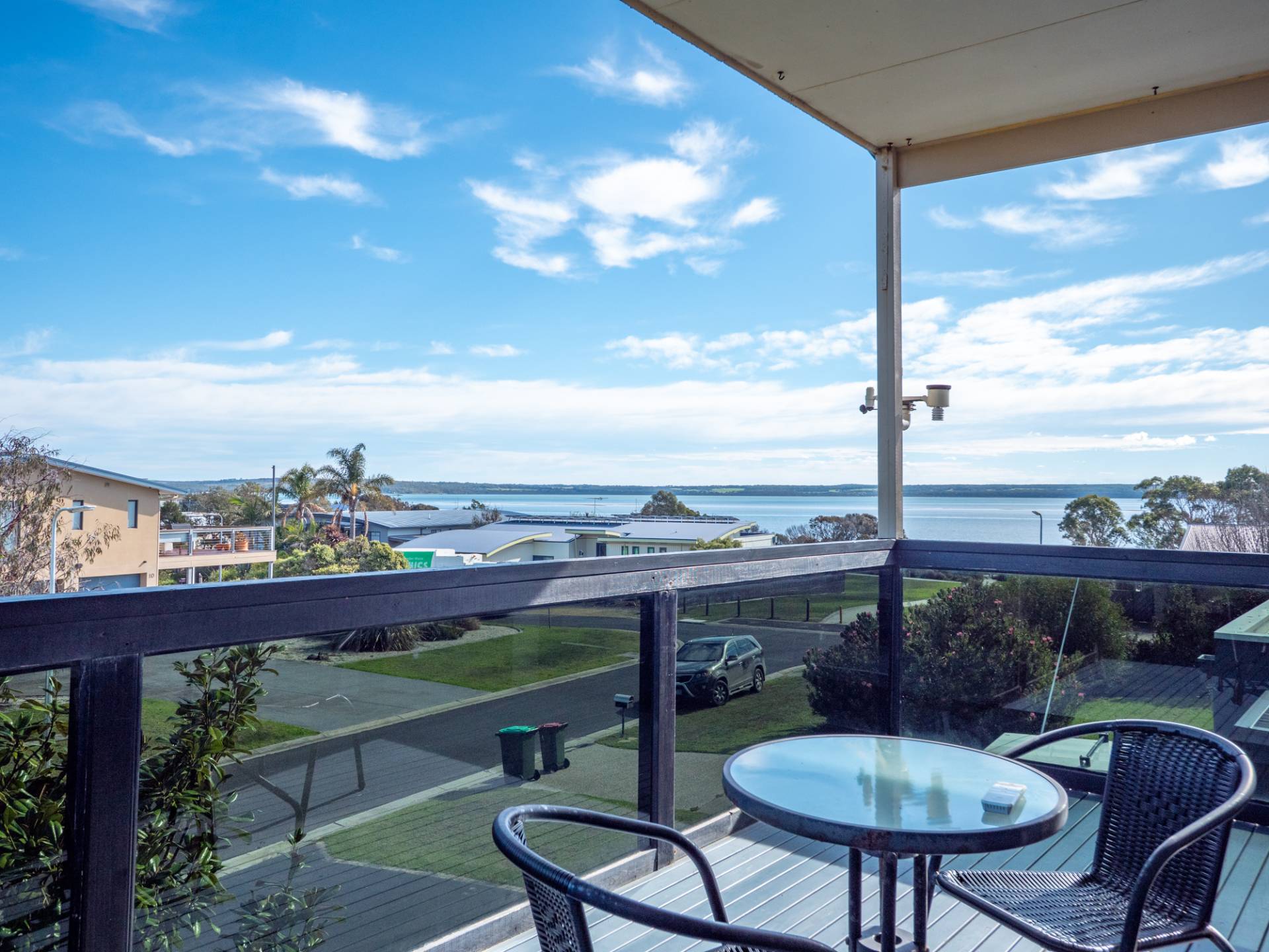 Upstairs are two more bedrooms, the spacious master which is complemented by a walk-thru robe, large en suite with spa bath , shower and separate toilet that can be also utilised from the 3rd bedroom for easy convenience.  Have your morning coffee from your bedroom balcony which captures beautiful views overlooking French Island.  The second living zone with water views and access to balcony makes it a welcoming space for adults to have their own privacy.