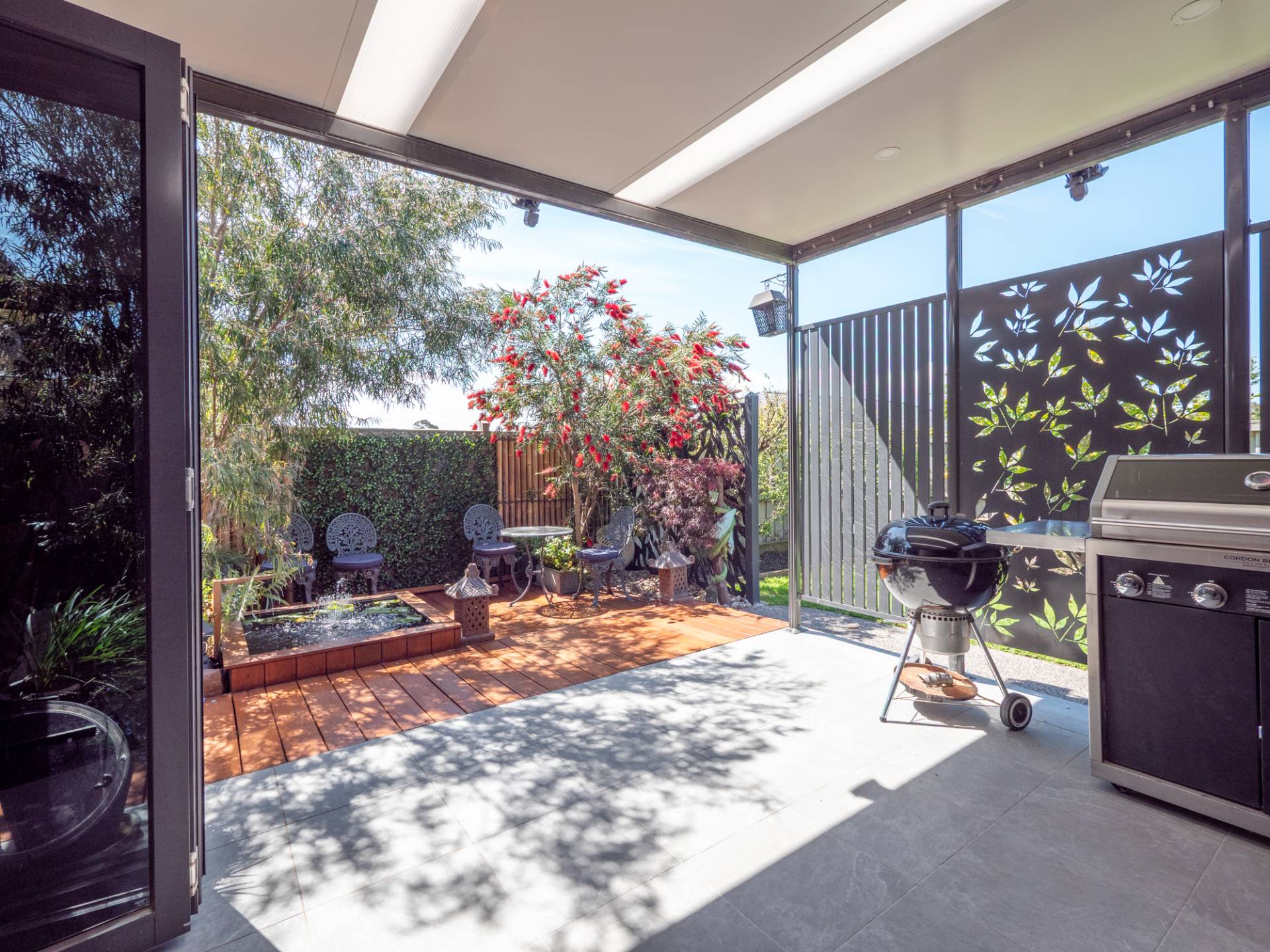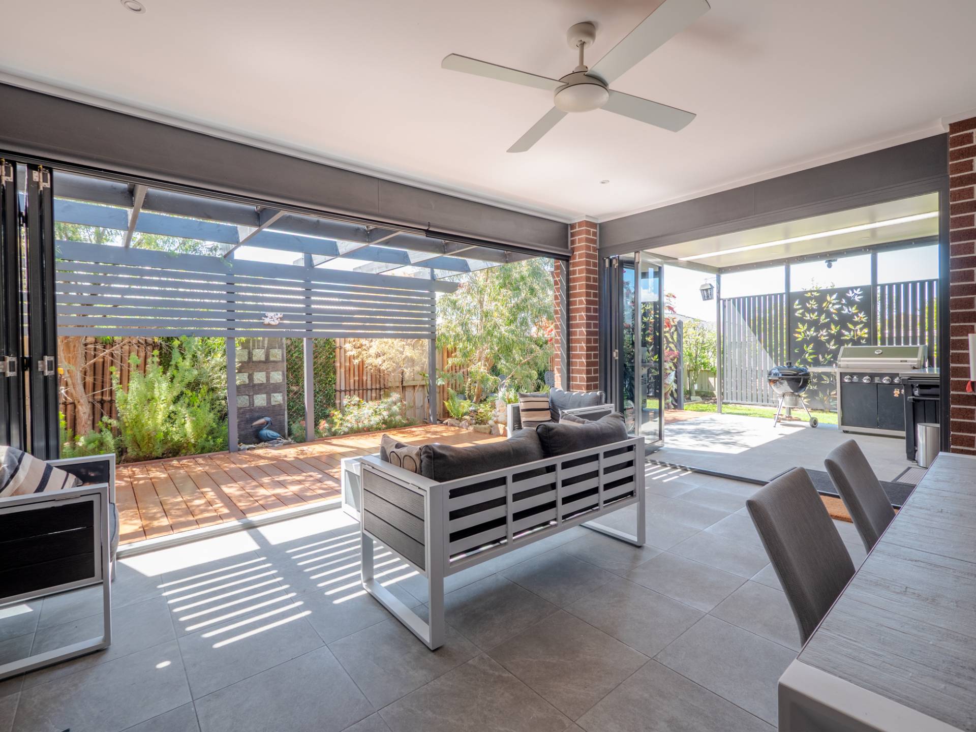 An open plan living, dining and kitchen zone, seamlessly connects the enclosed alfresco area with bi-fold doors making indoor – outdoor living effortless and also great for those balmy days to let the sea breeze through.